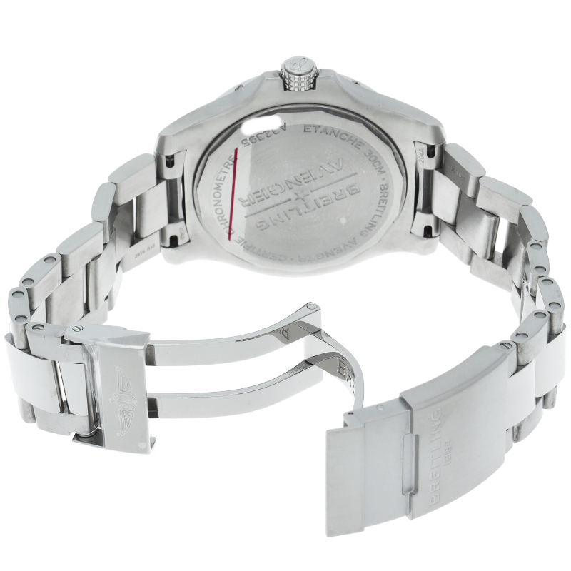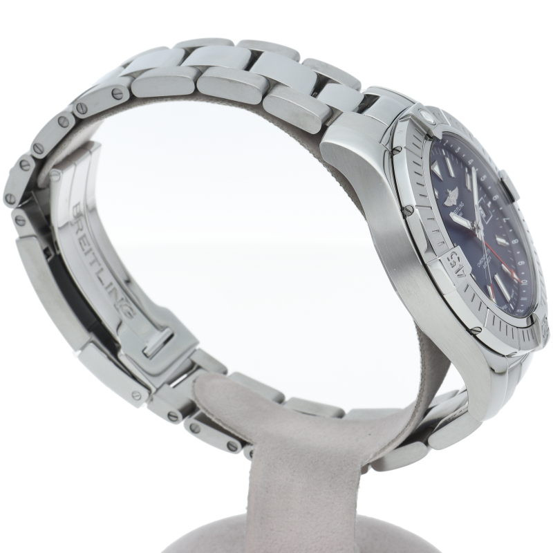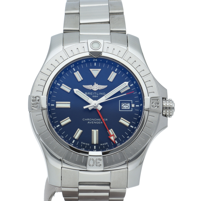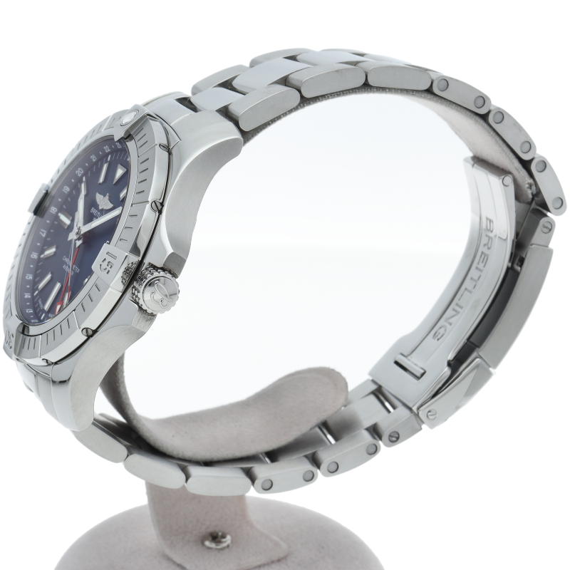 アベンジャー オートマチック GMT 45は、センターの時針・分針・秒針に加え、もう1本の針がセカンドタイムゾーンの時間を示します。心臓部で鼓動を打つのはブライトリングキャリバー32 自動巻き機械式ムーブメントで、パワーリザーブは約42時間。穴留め式またはフォールディングバックル式ミリタリーレザーストラップ、もしくはステンレススチール製ブレスレットとの組み合わせです。A32395(A32395101C1A1)