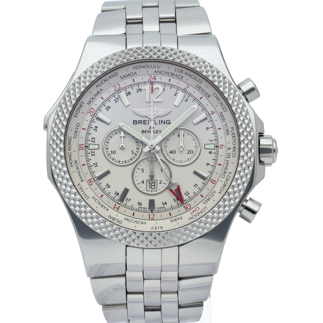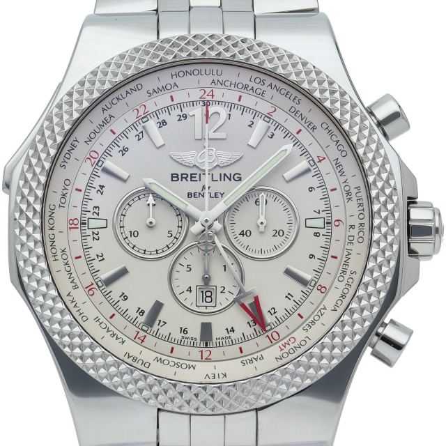 49mmの大型ケースが圧倒的な存在感を放つベントレー GMT。ラックピニオン式の回転ベゼルを操作することにより、インナーベゼルのシティコードディスクが回転し、ワールドタイムにもなるGMT機能を備えます。A47362(A476G57SGS)