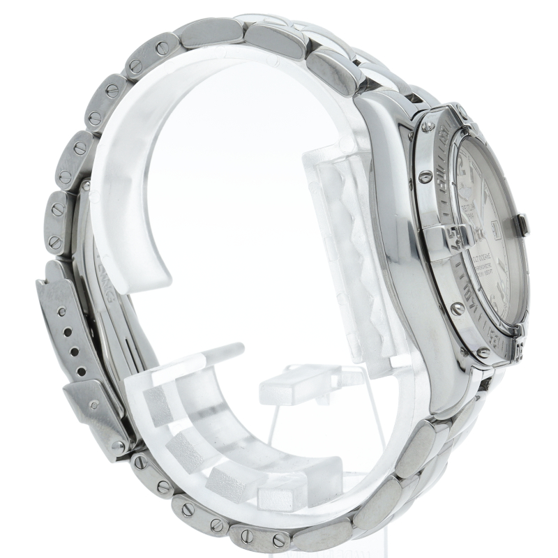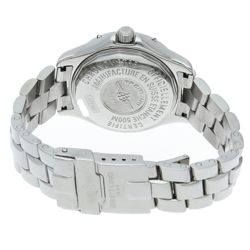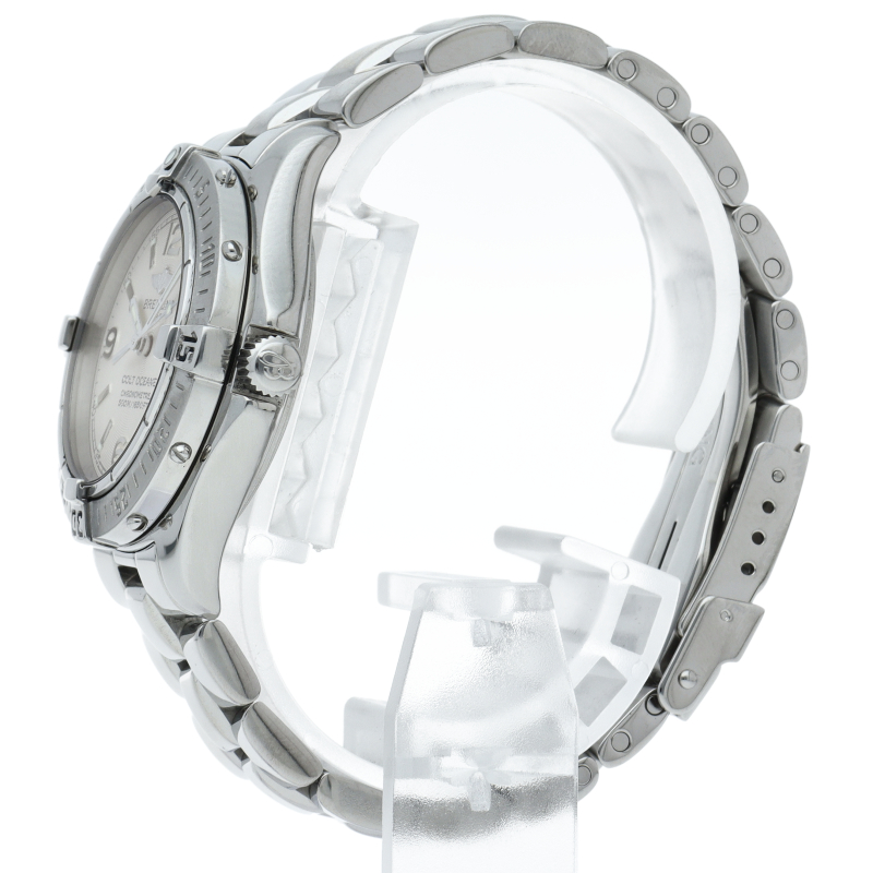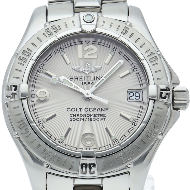 「コルト オーシャン」というモデル名の通り、こちらは500m防水という高機能を搭載したダイバーズウォッチです。ブライトリングを代表する機能であるライダータブ付きの回転ベゼルも装備。A77350。