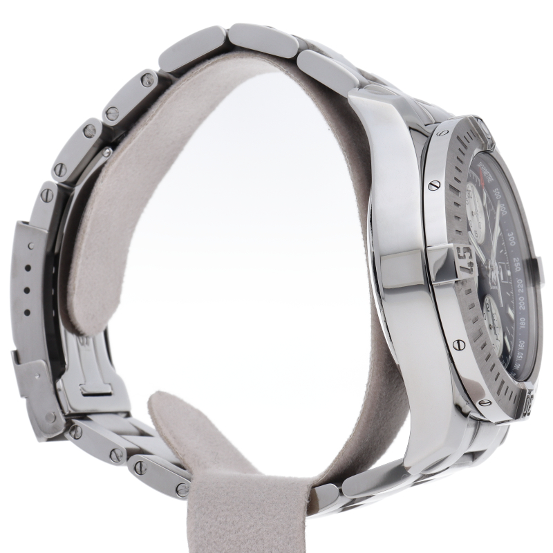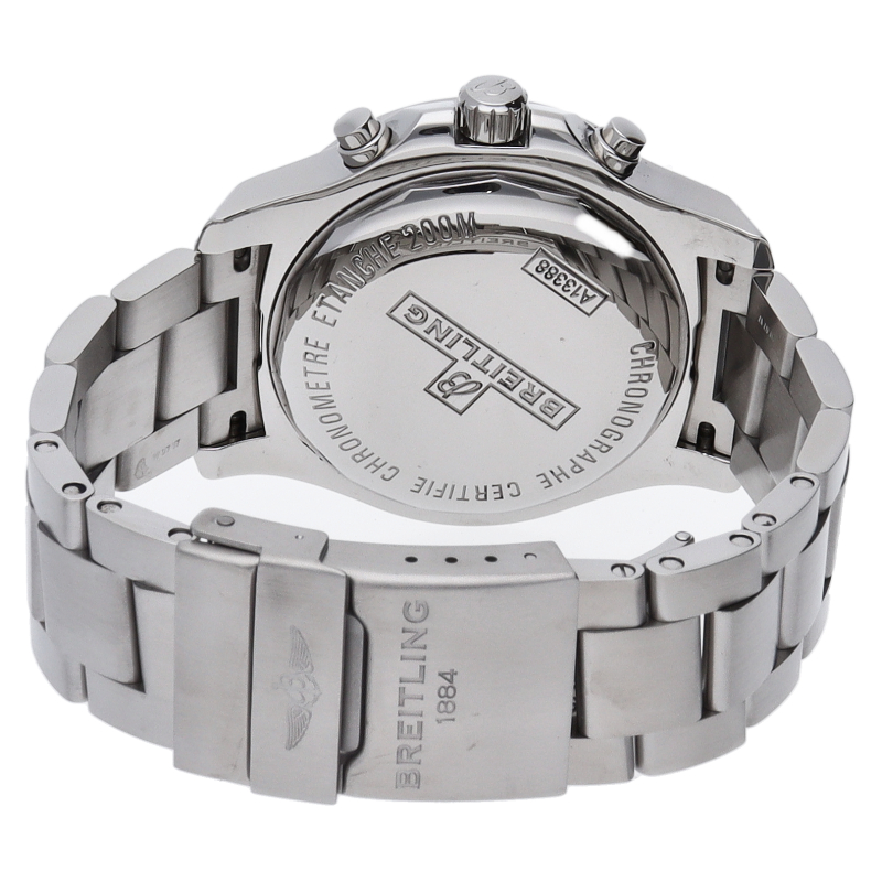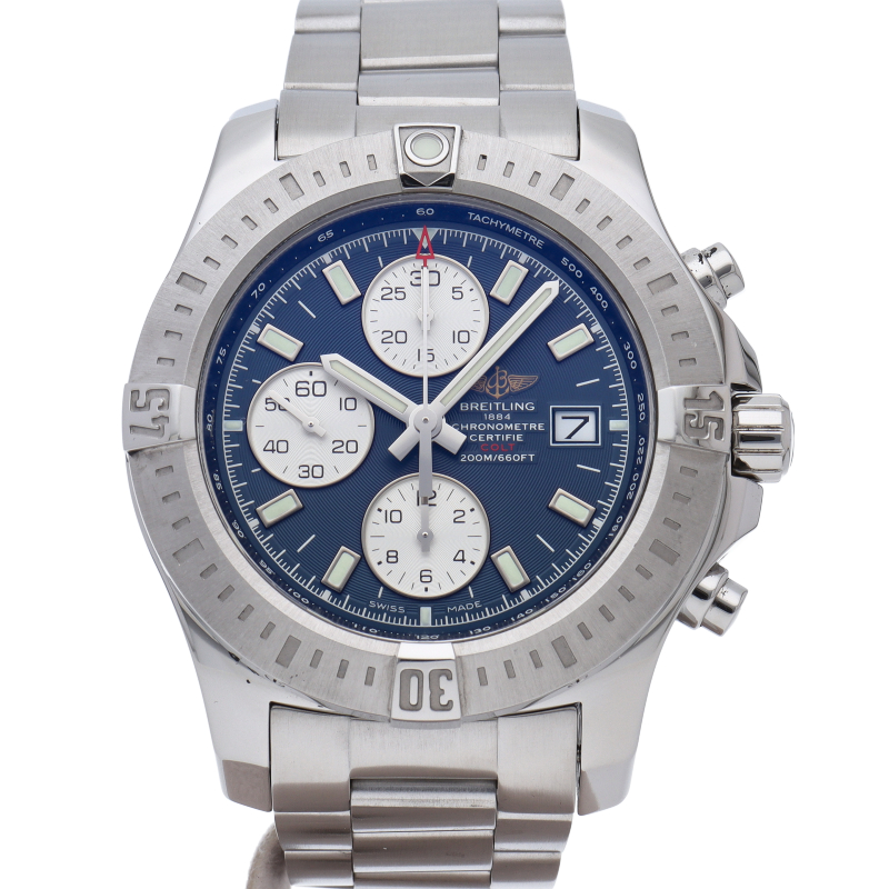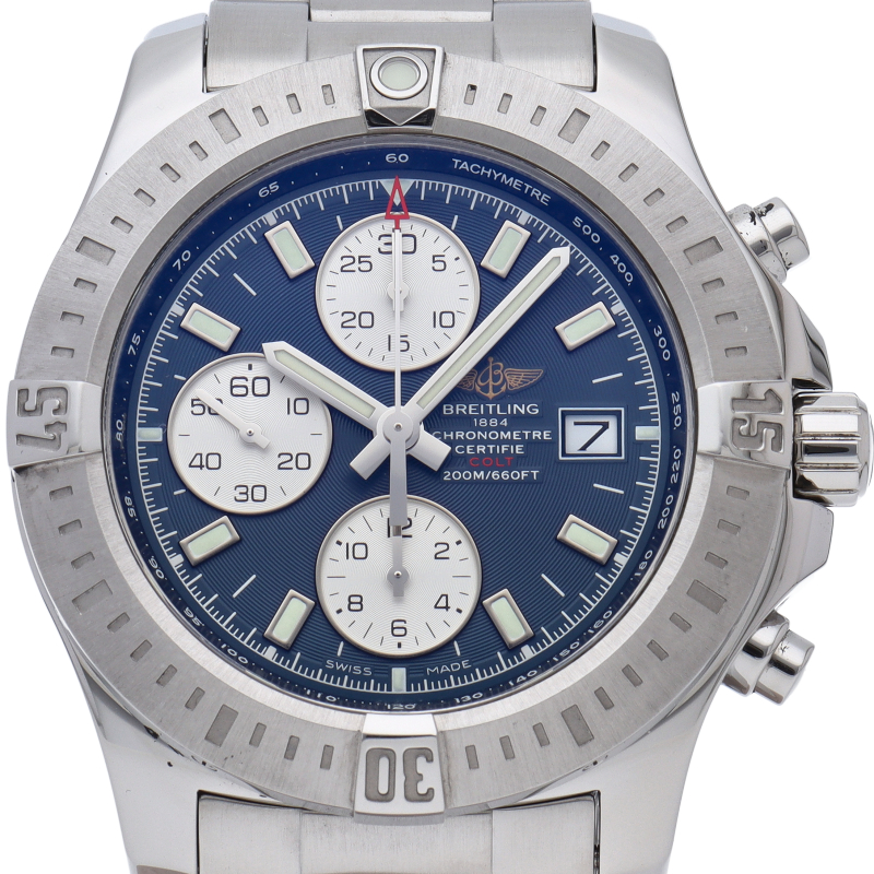 クロノグラフ機構を搭載した人気モデル「コルト クロノグラフ」。幅の広いサテン仕上げのベゼルには、ブライトリングファンにおなじみのライダータブが装備されます。A13388/A1338811C914。