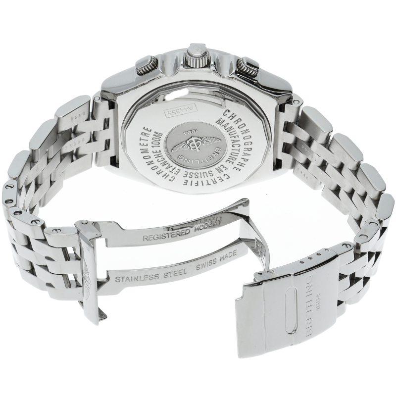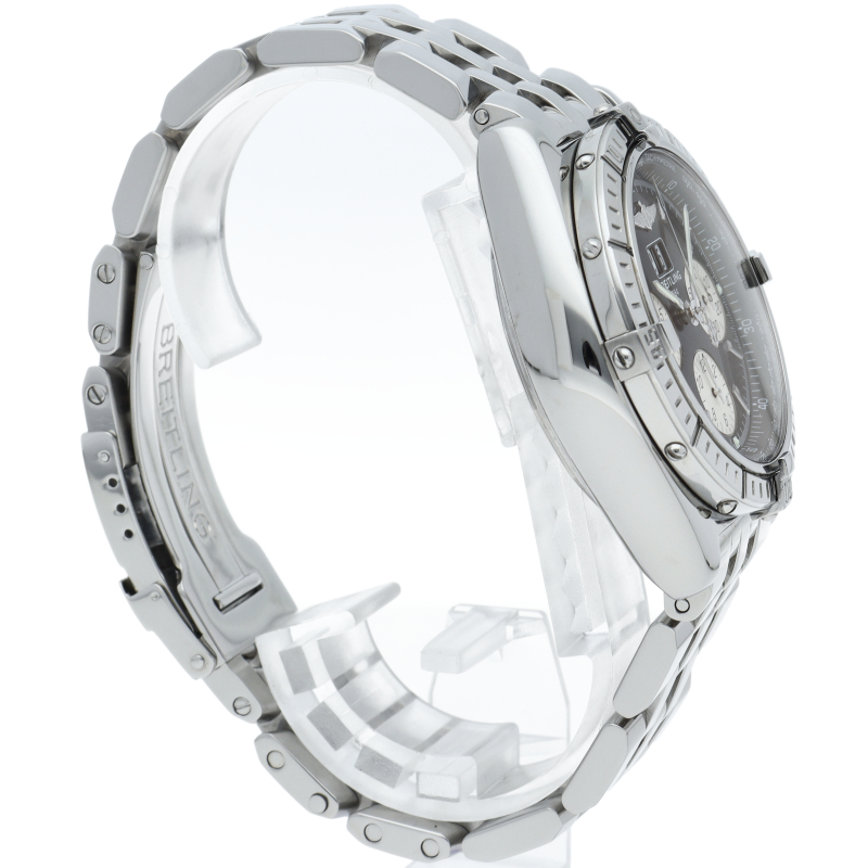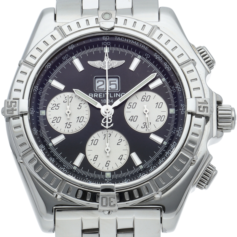 洗練されたスタイリングが魅力的な「クロスウィンド」。クロノマットと一線を介しケースは44ミリに。ビッグデイトも備えオン・オフ問わず使用できます。A44355/A445B13VPR