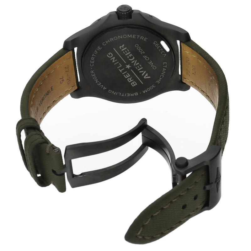 2001年に誕生した「アベンジャー」は、ナビタイマー、アビエイターに並び“空”に関連したコレクション。頑強ながらも軽量なDLCコーティングチタン製ケースとブラックの文字盤は相性もよく、航空母艦の甲板にみられるようなステンシル書体にインスパイアされたアラビア数字もブラックの文字盤によく映えます。ムーブメントはパワーリザーブ約42時間の「ブライトリング32」を搭載。2000本限定。