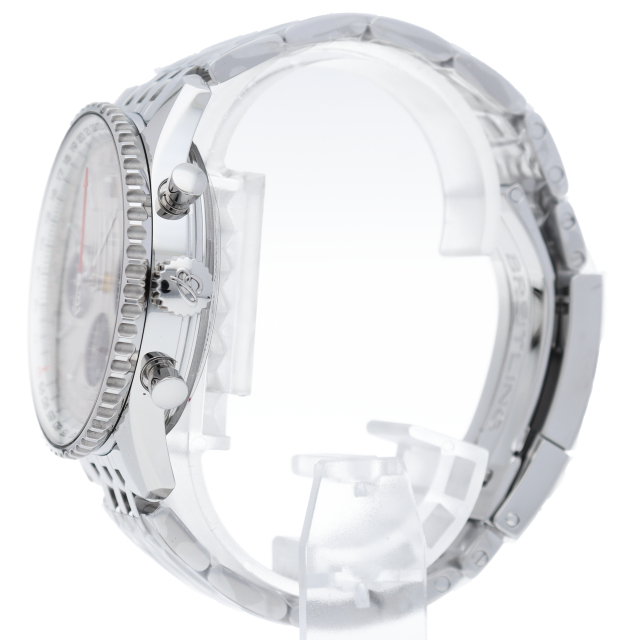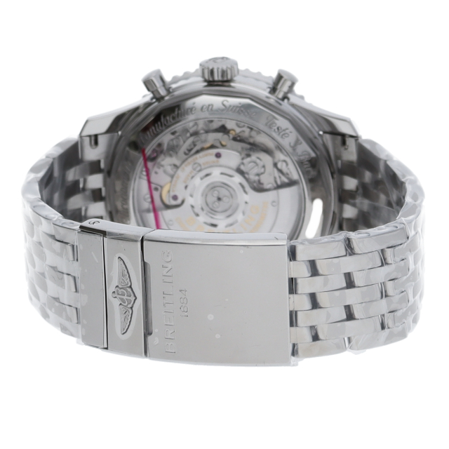 航空用回転計算尺を装備して1952年に発表されて以来、世界で最も愛されるクロノグラフの一つというステータスを維持し続けているナビタイマー。AB0121211G1A1。