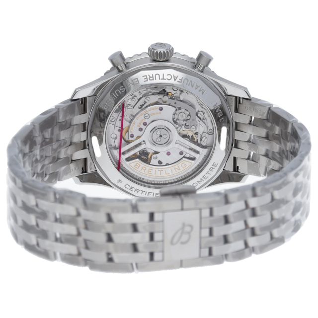 この新しいナビタイマーはその最もクラシックな特徴を保ちながらも、現代に即した改良を加えています。平らにした回転計算尺とドーム型クリスタルで、よりスリムな外観を実現。ポリッシュとサテン仕上げを交互に施した金属部品を採用したことで、光沢を出しつつも控えめな印象になっています。AB0138(AB0138241C1A1)。