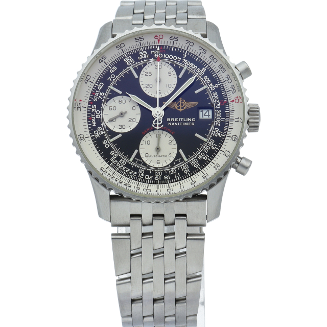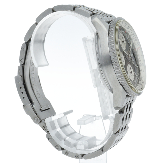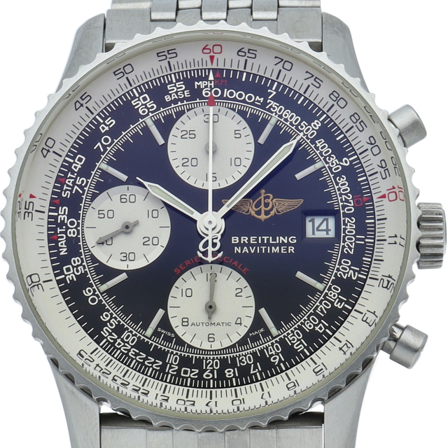 ブライトリングのアクロバット飛行チーム「ブライトリング・ファイターズ」に捧げられた特別モデル。ナビタイマーでは珍しいサテン仕上げ(艶消し加工)が施されており、上品で落ち着いた印象を与えます。A13330(A153BFTNP)。