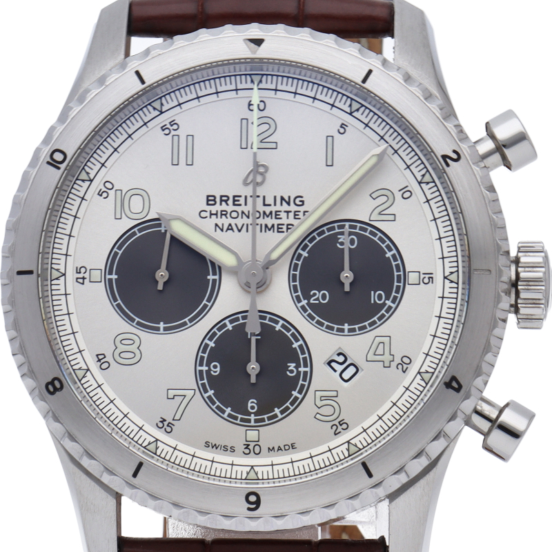 新しく「ナビタイマー」シリーズに加わったクラシックなデザインのパイロットウォッチ「ナビタイマー8」。「8」とは1938年に設立されたユイット・アビエーション部門の名に由来しています。AB0117(AB01171A1G1P1)