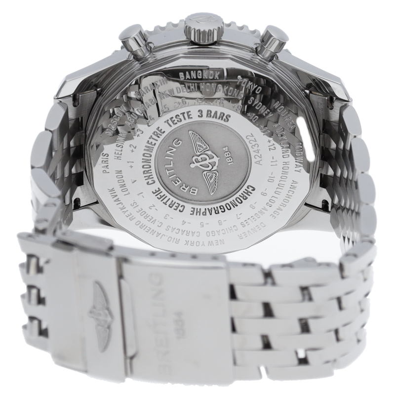 ナビタイマーワールドは、世界のあらゆる時刻を表示できるナビタイマーです。搭載されているムーブメント、キャリバー24は第2タイムゾーン表示機能をそなえ、世界のあらゆる時刻を24時間スケールで表示します。A24322(A2432212/C651)。