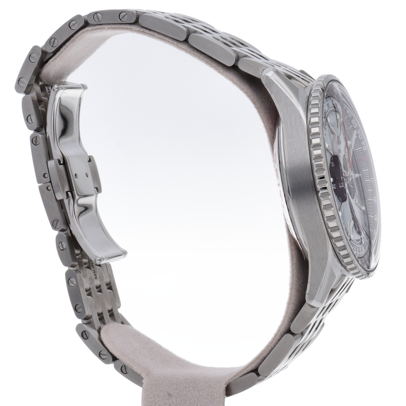 この新しいナビタイマーはその最もクラシックな特徴を保ちながらも、現代に即した改良を加えています。平らにした回転計算尺とドーム型クリスタルで、よりスリムな外観を実現。ポリッシュとサテン仕上げを交互に施した金属部品を採用したことで、光沢を出しつつも控えめな印象になっています。AB0138(AB0138241C1A1)。