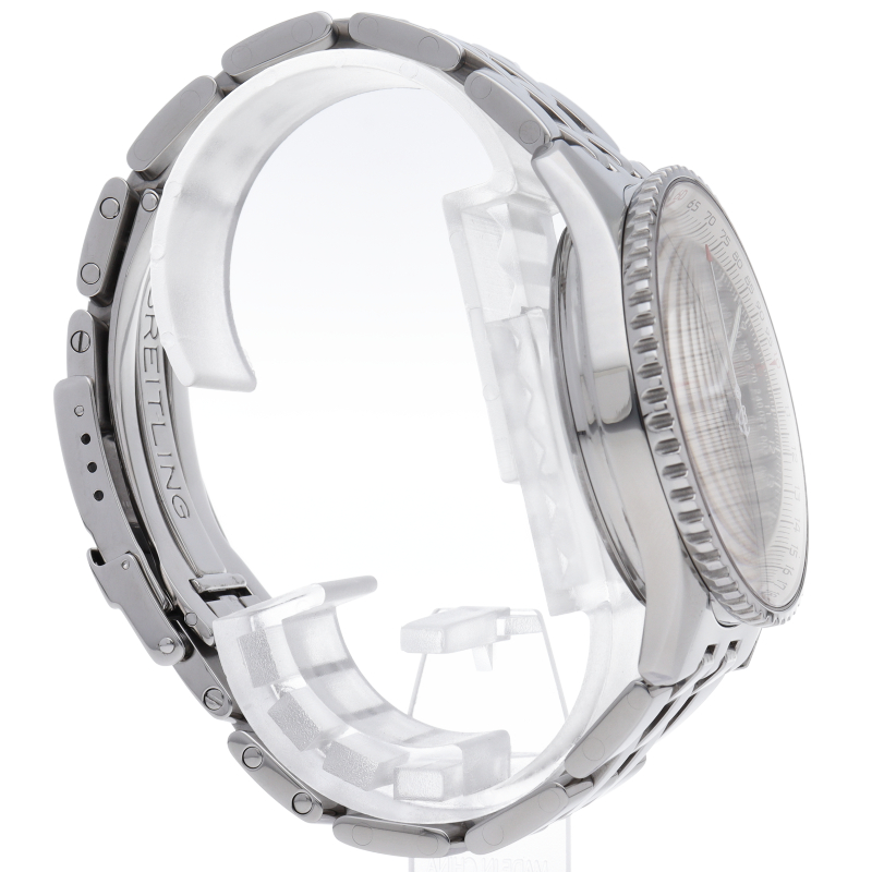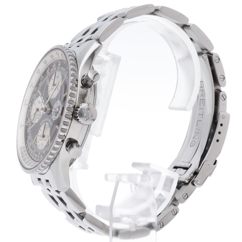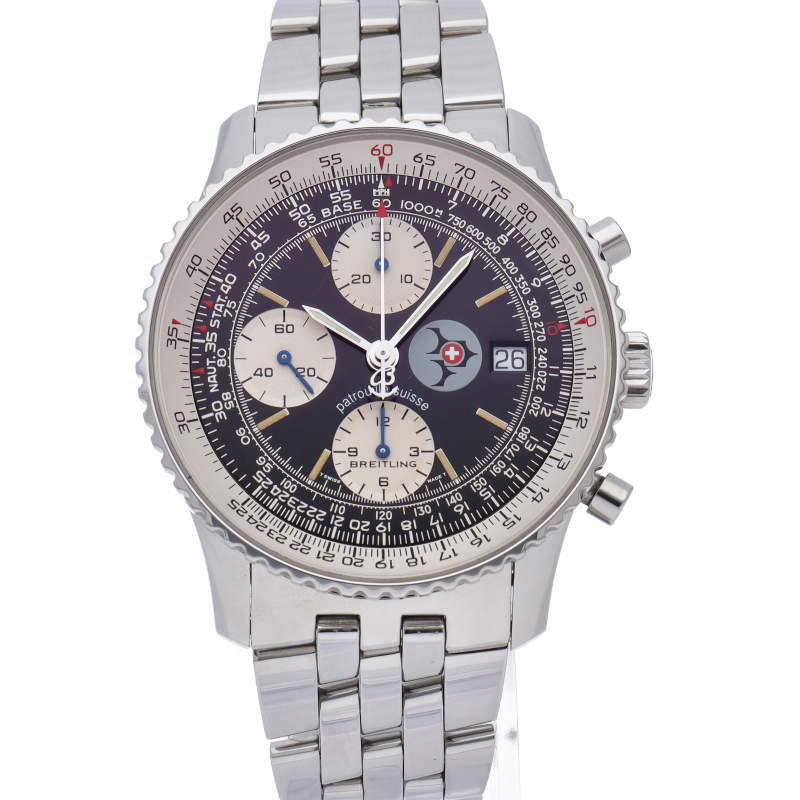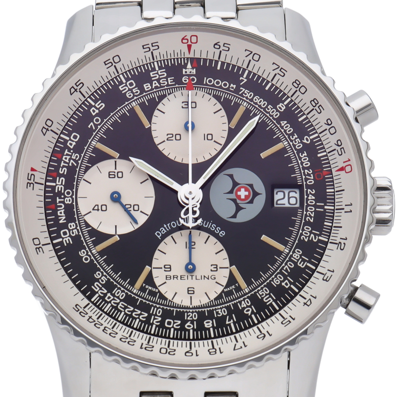 1952年の発表から現在まで受け継がれているナビタイマー。こちらは現在生産が終了している縦目のインダイアル「オールドナビタイマー」。スイスの空軍アクロバットチーム「パトレイユ・スイス」とのコラボレーション限定モデルでダイアル3時位置にパトルイユ・スイスのエンブレムが入った特別仕様です。A13022。