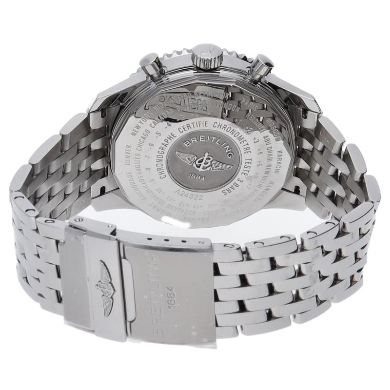 ナビタイマーワールドは、世界のあらゆる時刻を表示できるナビタイマーです。搭載されているムーブメント、キャリバー24は第2タイムゾーン表示機能をそなえ、世界のあらゆる時刻を24時間スケールで表示します。A24322/A242B26NP。