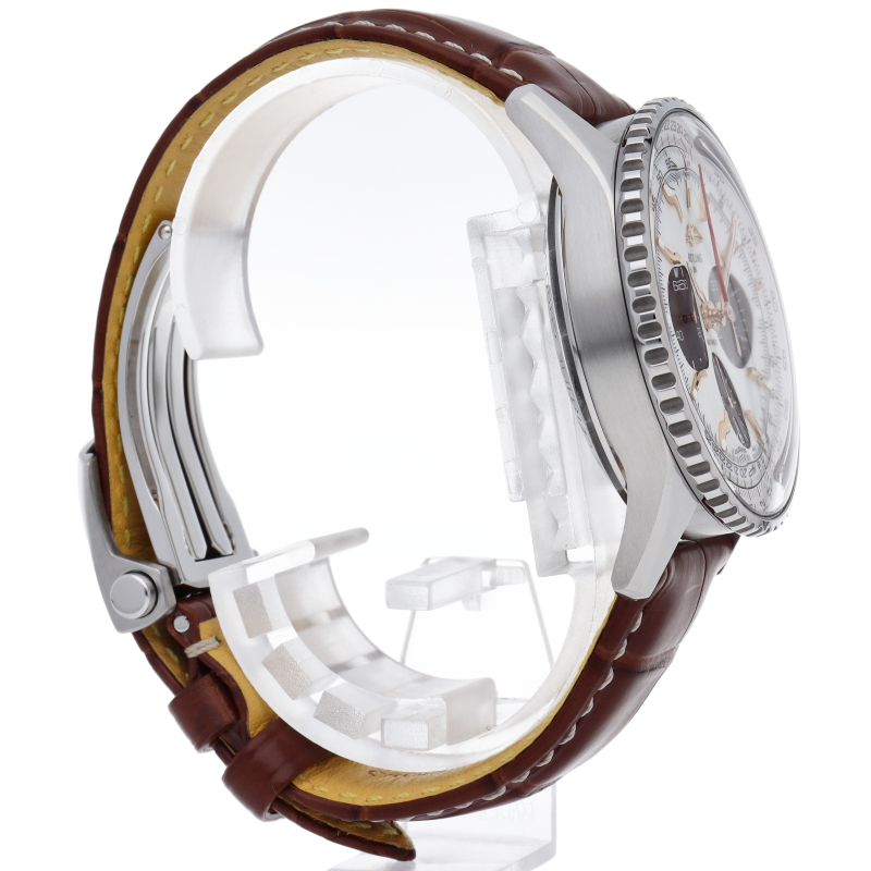 クロノマットと並びブライトリングを代表するコレクションであるナビタイマー。日本限定モデルとして人気の高いシェル文字盤を初めてナビタイマーに採用したジャパンエディション。フェイス中央にホワイトシェル、計算尺部分はシルバー、インダイヤルにはグレー、針とインデックスにはゴールドを採用し、全ての色が見事に調和し上品な印象のナビタイマーに仕上がっています。AB0139/AB0139211A1P1