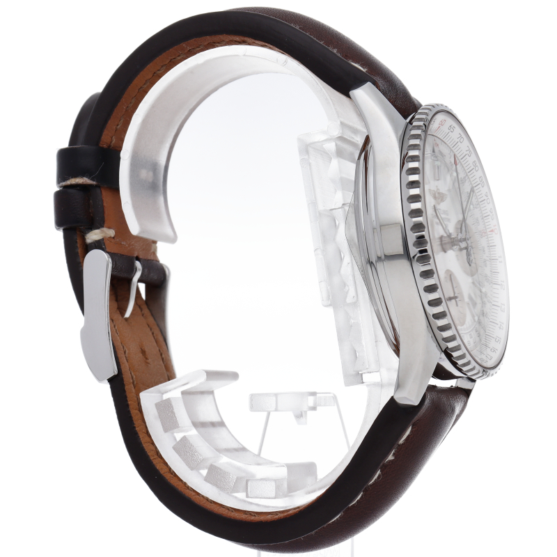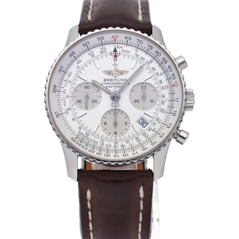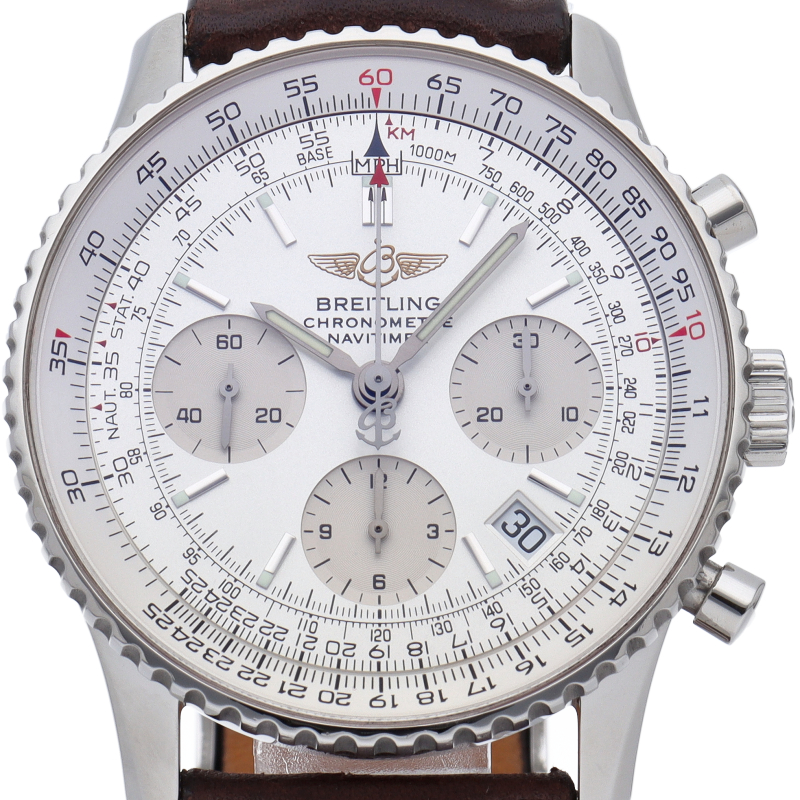 「時計ではない、計器である」ブライトリングの1990年代初頭のキャッチコピーをそのまま体現した「ナビタイマー」。回転計算尺を用いた特殊ベゼルとクロノグラフが特徴的なモデルです。バリエーションの多いラインの中でも、特に人気の高いシルバーダイヤルです。A23322