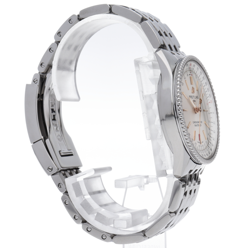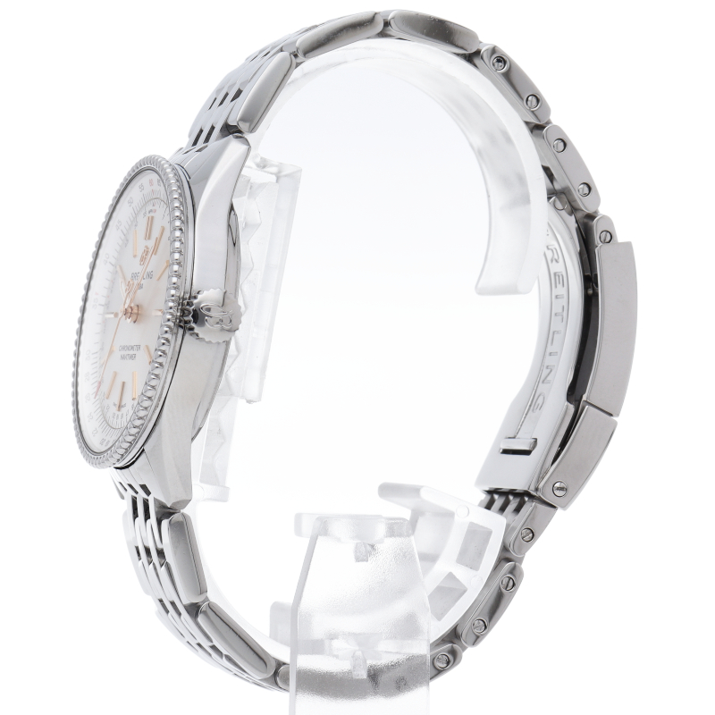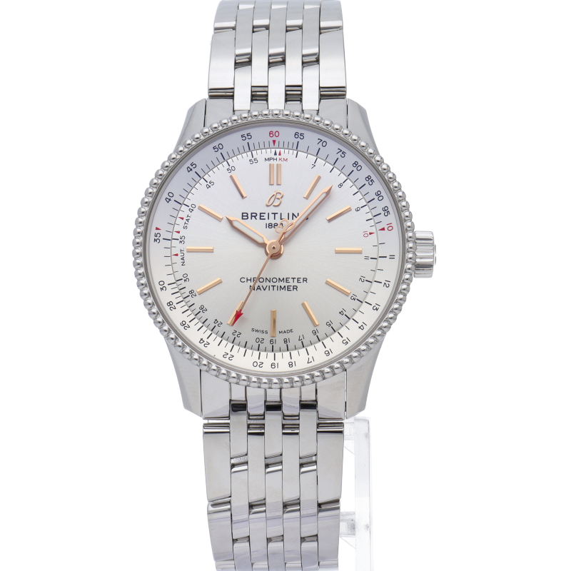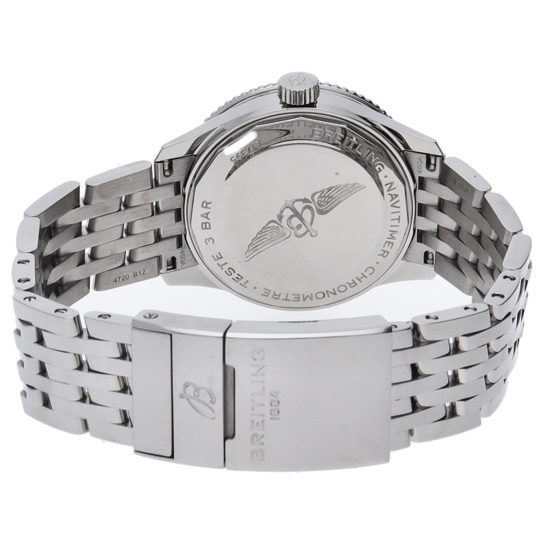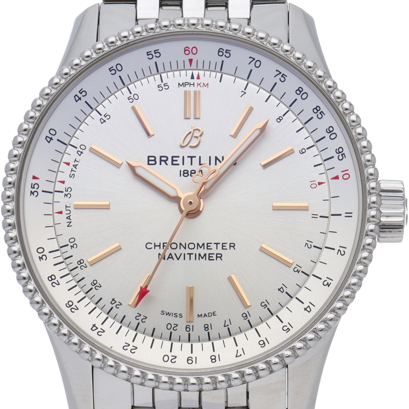 新生ブライトリングが2018年に発表した「ナビタイマー1 オートマチック35」。こちらはかつてブライトリングが3針モデルを初めて発表した1950年代まで時をさかのぼりつつデザインされた新しいナビタイマーオートマチック35です。クロノグラフ機能を取り除きすっきりとした印象の文字盤ですが、ナビタイマーを特徴付ける両方向回転式航空用計算尺を設けたパイロットウォッチです。A17395/A17395F41G1A1