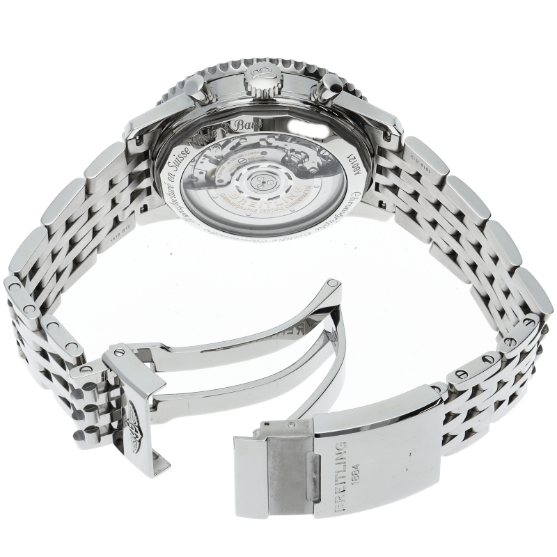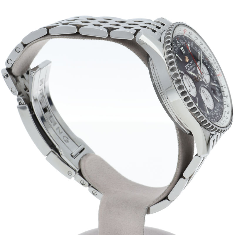 1952年に発表されたブライトリングのシンボル「ナビタイマー」シリーズ。回転計算尺を用いた特殊ベゼルとクロノグラフが特徴的なモデルで、そのデザインからデイリーウォッチとしても人気な腕時計です。日本限定で販売されたこちらのモデルは、ブラックシェルの文字盤がラグジュアリーさを感じさせる特別なデザインです。