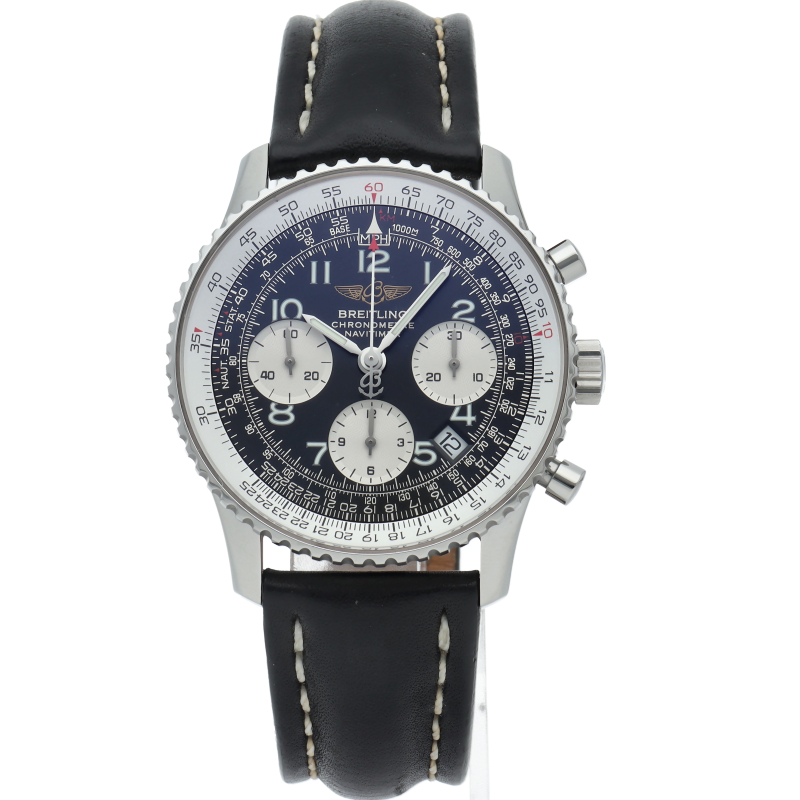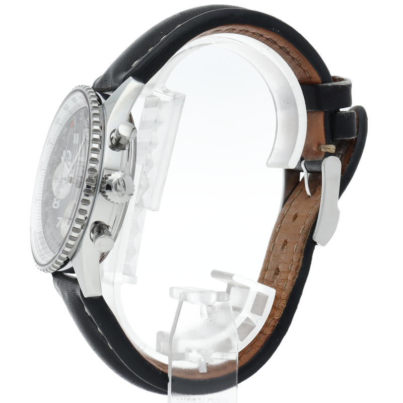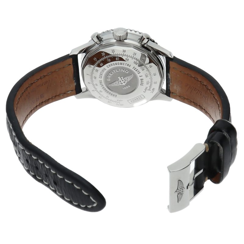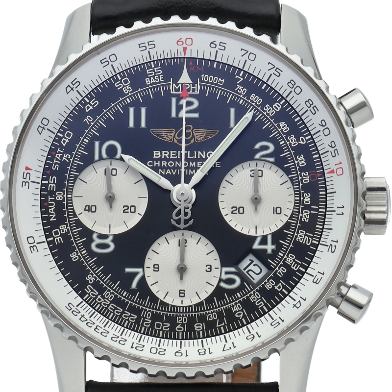 「時計ではない、計器である」ブライトリングの1990年代初頭のキャッチコピーをそのまま体現した「ナビタイマー」。回転計算尺を用いた特殊ベゼルとクロノグラフが特徴的なモデルです。シックなブラックダイアルのため、スーツにも合わせやすいのではないでしょうか。A23322/A232B37KBA。