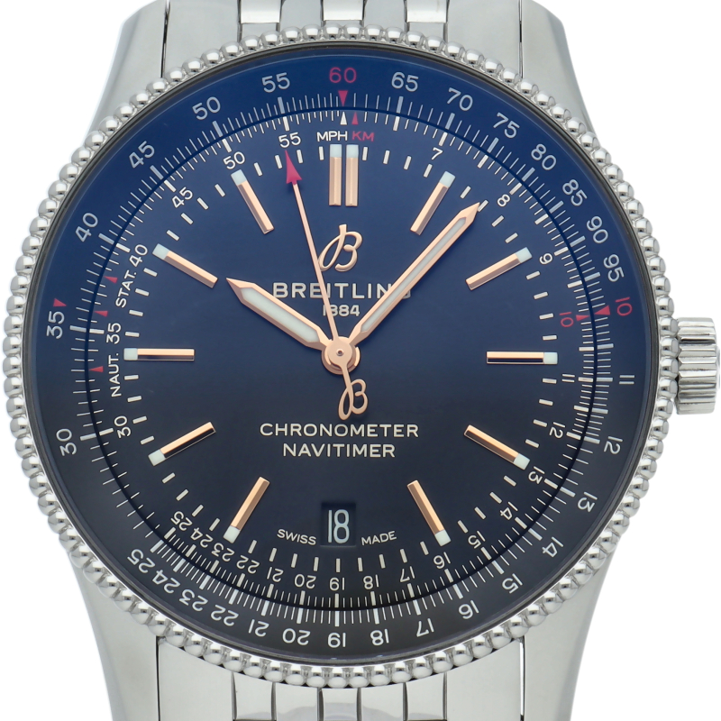 新生ブライトリングが2018年に発表した「ナビタイマー1 オートマチック38」は、かつてブライトリングが3針モデルを初めて発表した1950年代まで時をさかのぼりつつデザインされた新しいナビタイマーです。クロノグラフ機能を取り除きすっきりとした印象の文字盤ですが、ナビタイマーを特徴付ける両方向回転式航空用計算尺を設けたパイロットウォッチです。A17326/A17326241B1A1。