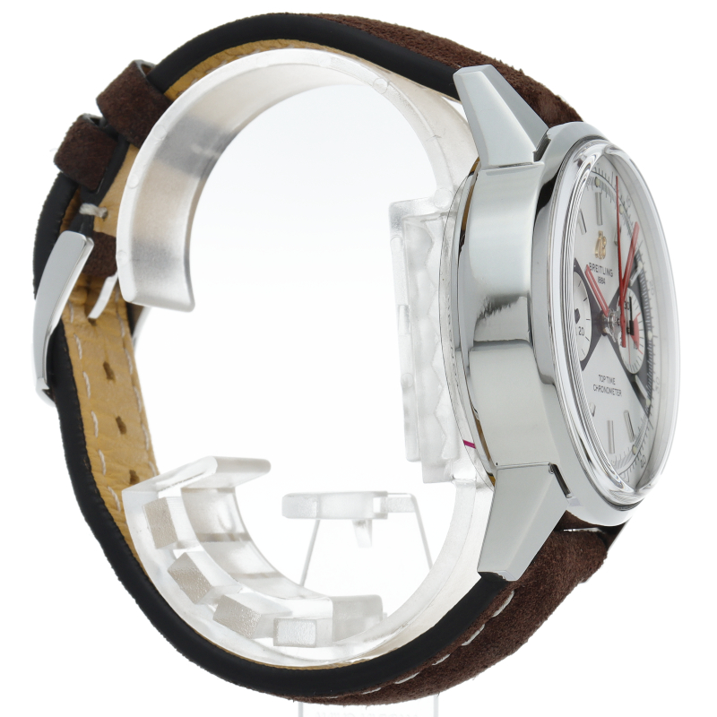 特徴的かつ個性的なスタイルが際立つ「トップタイム」。ブライトリングの歴史を感じるスタイリッシュでモダンなデザインながらも、高性能クロノグラフを備えた注目のモデルです。幅広い「超モダンなクロノグラフ」で「若く活動的なプロ」のニーズに応えるという明確なミッションを掲げて1960年代に発売が開始された「トップタイム」シリーズは、そのデザイン性の高さから男性だけでなく女性にも人気を博しました。