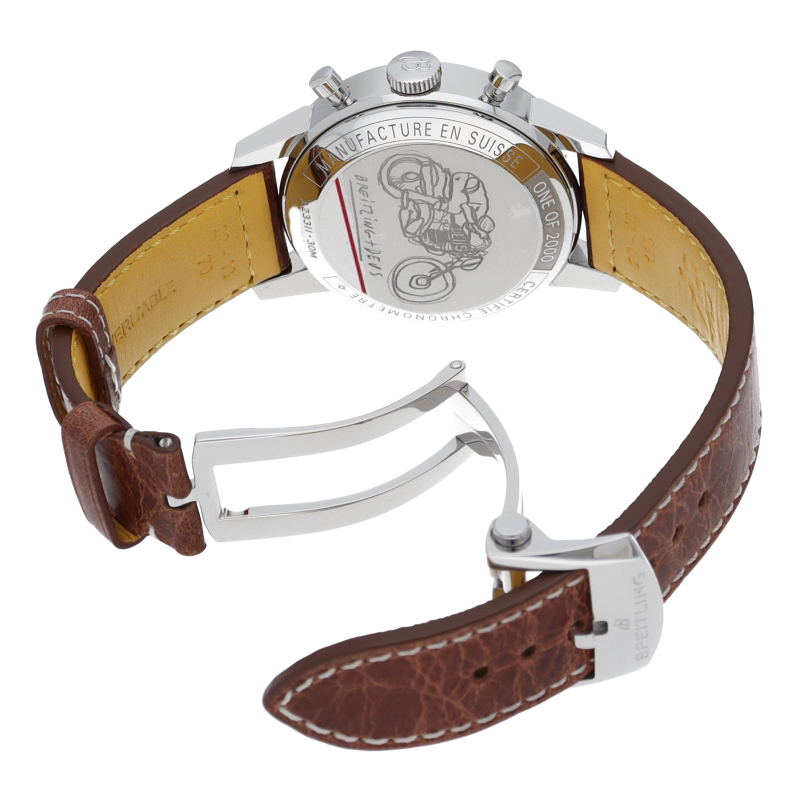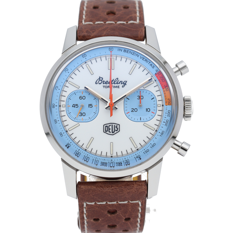 1960年代の自由奔放なカフェレーサースピリッツを携えたブライトリングの型破りなクロノグラフ「トップタイム」。トップタイム デウスは、オーストラリアのライフスタイルブランドでカスタムモーターサイクルとサーフファッションを提供する「デウス・エクス・マキナ」との共同デザインによる新作。A23311/A233112A1A1X1。