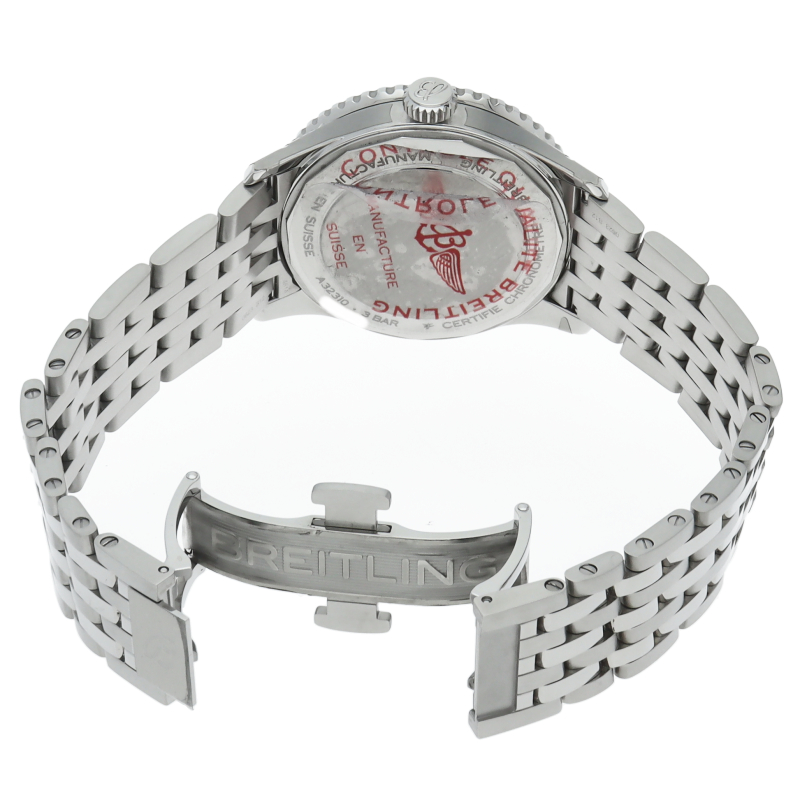 ブライトリングの代表作「ナビタイマー」からアイコニックな外観を取り入れながらクロノグラフを省き、バランスの取れたダイヤル構成になっています。24時間目盛りを中央に配置することで、複雑な計算尺を際立たせながら、全体的な美しさを引き締めています。A32310251B1A1。