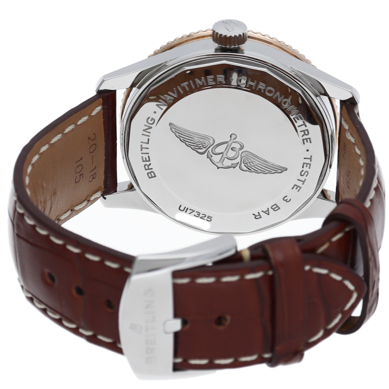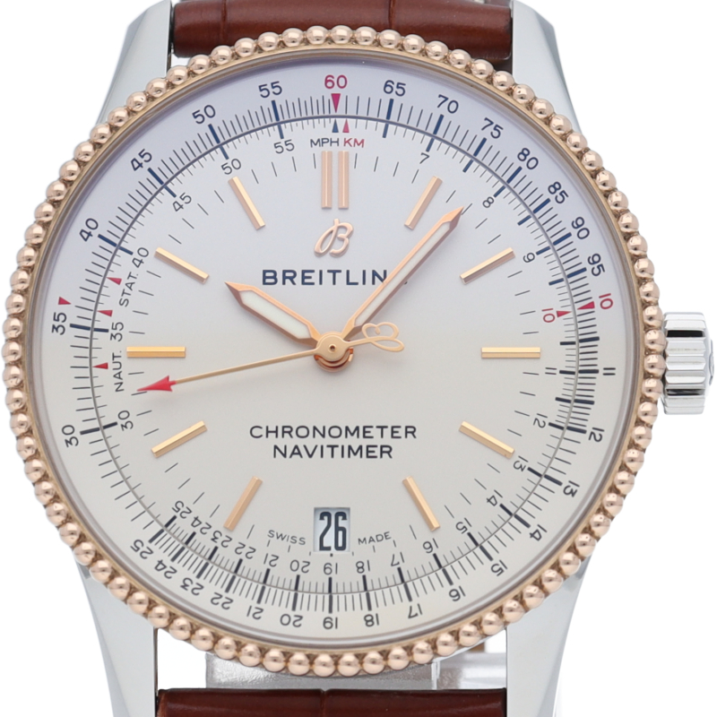 新生ブライトリングが2018年に発表した「ナビタイマー1 オートマチック38」は、かつてブライトリングが3針モデルを初めて発表した1950年代まで時をさかのぼりつつデザインされた新しいナビタイマーオートマチック38です。クロノグラフ機能を取り除きすっきりとした印象の文字盤ですが、ナビタイマーを特徴付ける両方向回転式航空用計算尺を設けたパイロットウォッチです。