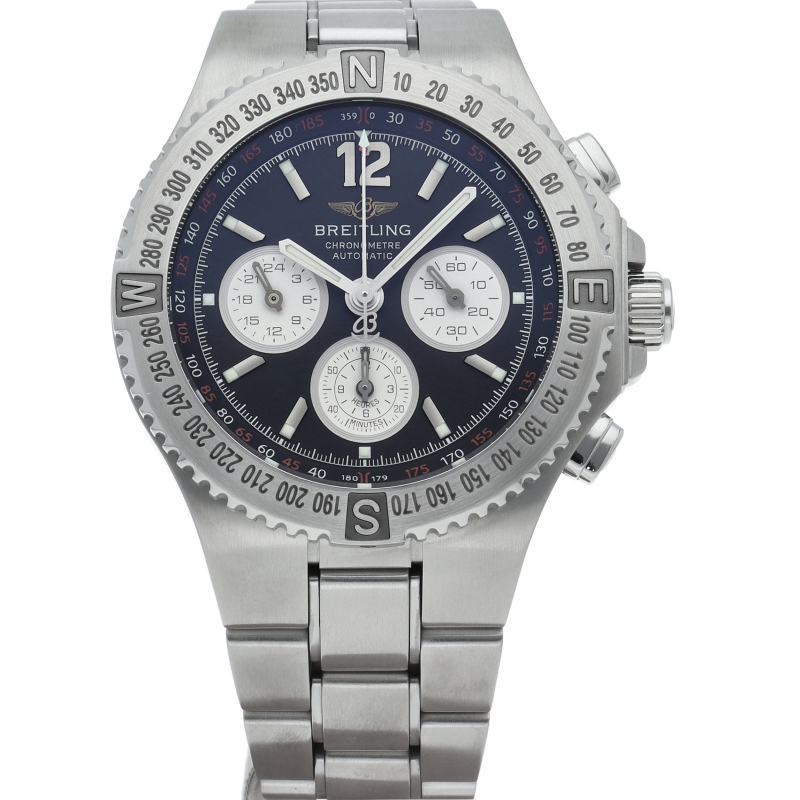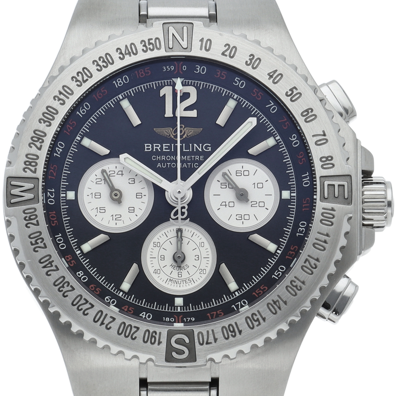 発表当時、ブライトリング・クロノグラフモデルの中の最大ケース径を誇り「英雄・ヘラクレス(HERCULES)」からネーミングされた「ハーキュリーズ」。特徴はクロノグラフ機能がセンター位置 と6時位置 の2ヶ所に設けられています。長時間の経過時間を確認するのは6時位置のインダイヤルの60分計、12時間計で1時間以内の計測にはセンター位置の60分計・1分計が役立ちます。
