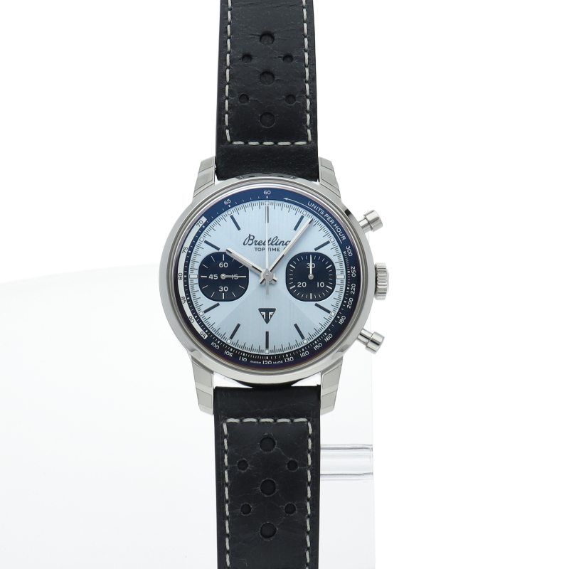 1960年代の自由奔放なカフェレーサースピリッツを携えたブライトリングの型破りなクロノグラフ「トップタイム」。通常このデザインはゾロのマスクのように2つのサブカウンターを縁取るコントラストカラーで表現しますが、このモデルに関しては、光とテクスチャーの調和が生み出す輝きを表現しました。クロノグラフのストップ&スタートとリセット機能を簡単に操作できる大型のマッシュルームプッシャーも特徴的です。