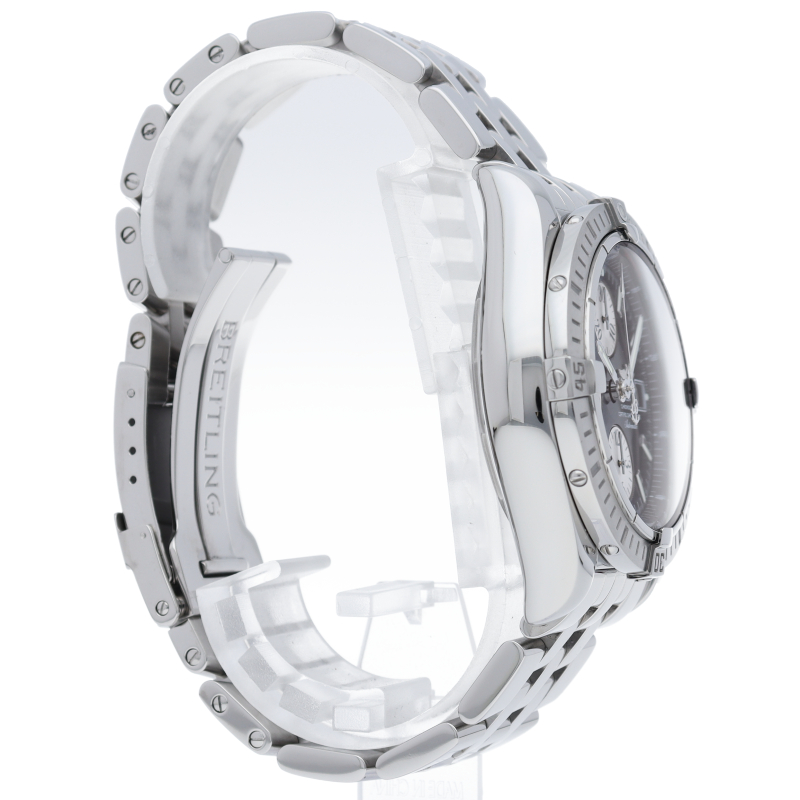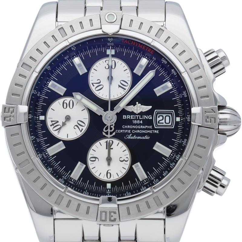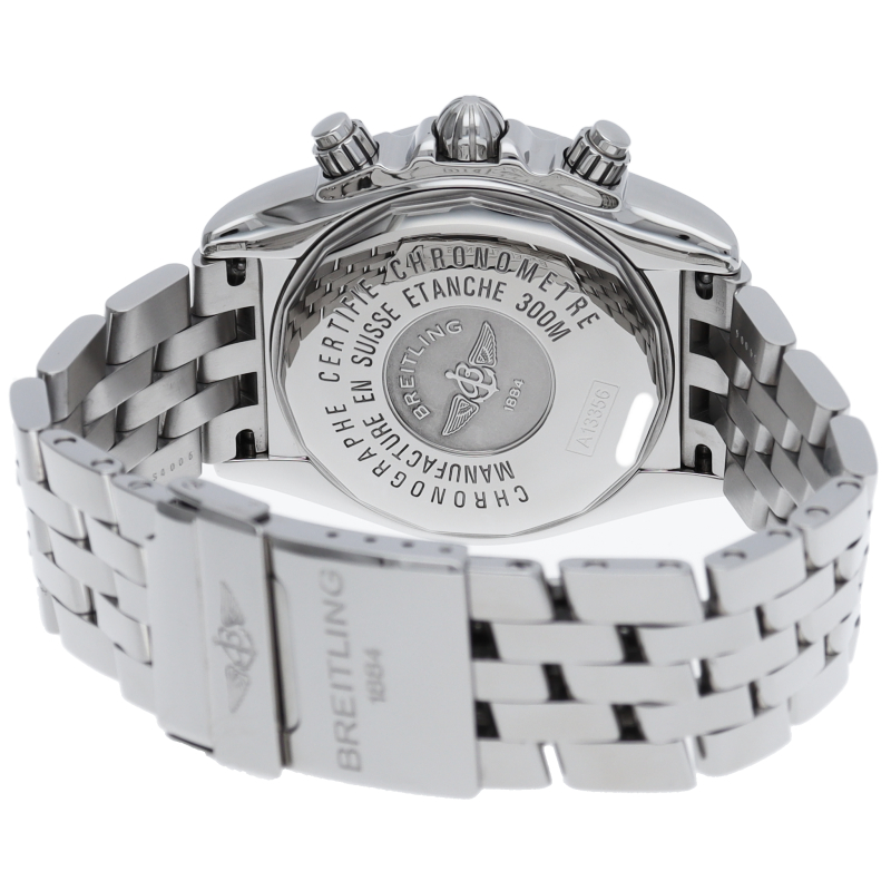 ブライトリングの生産終了となった人気モデル。存在感のあるビッグケースにデイト表示・逆回転防止ベゼルを備えたデザイン性と実用性の兼ね備えた1本。A13356/A156B19PA。