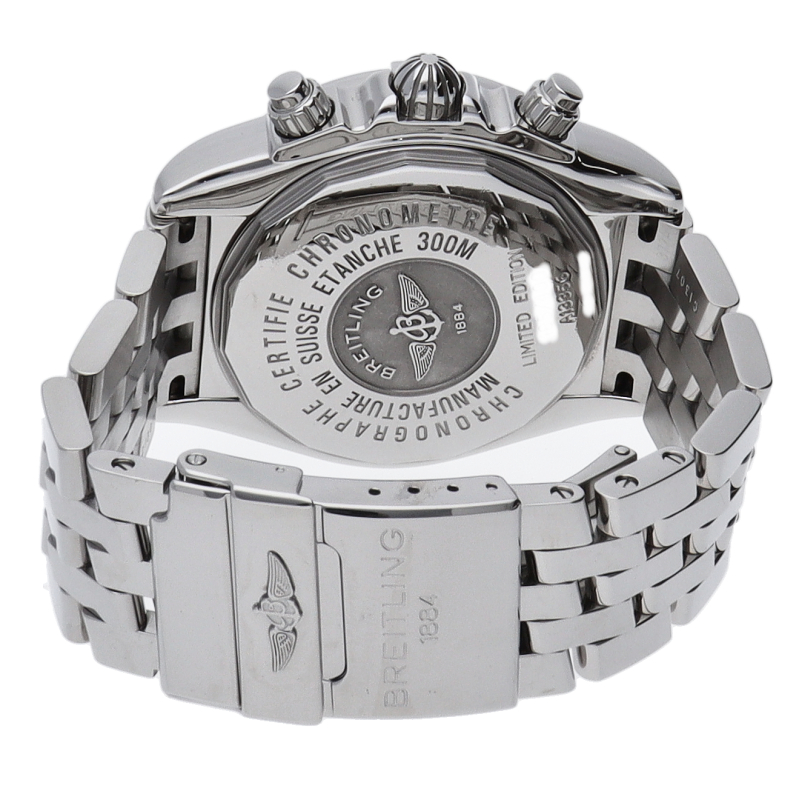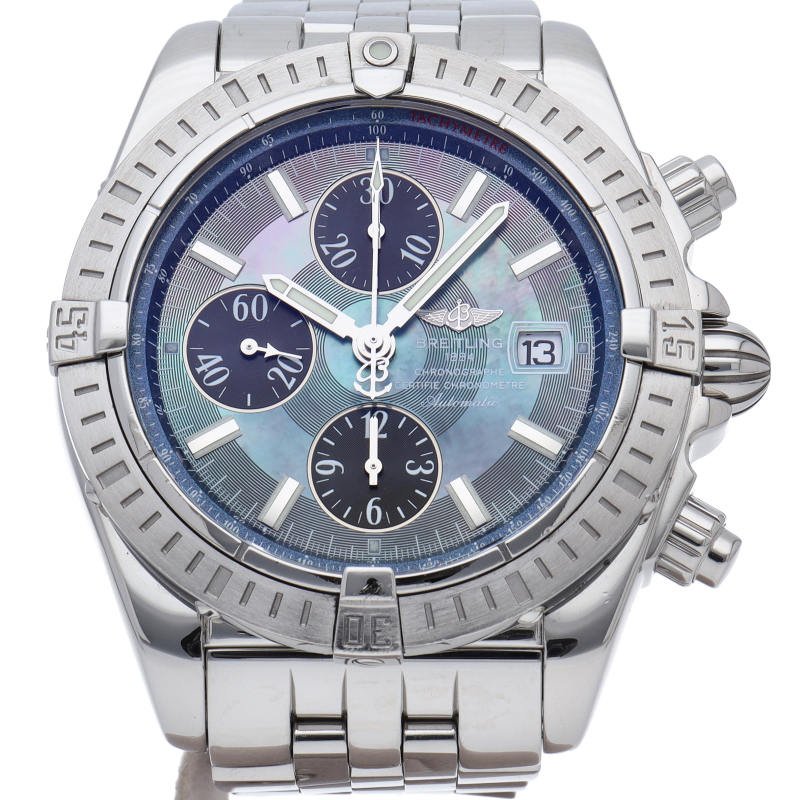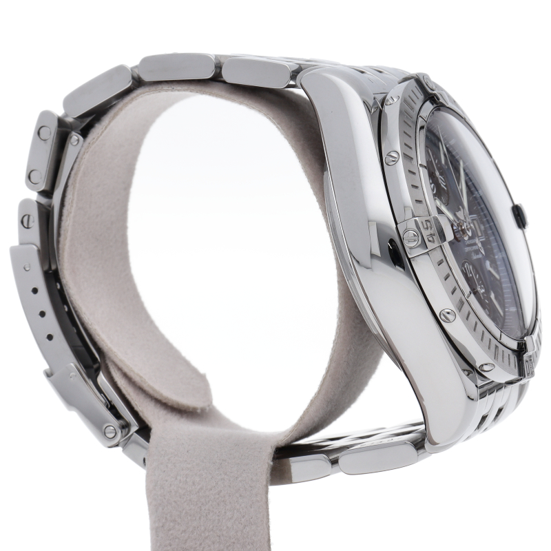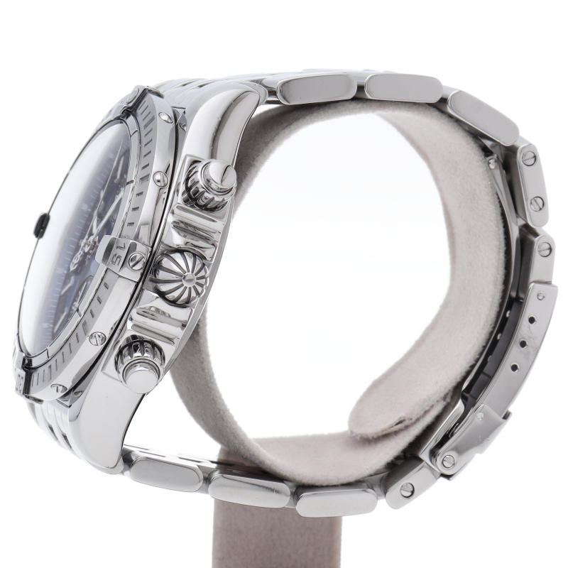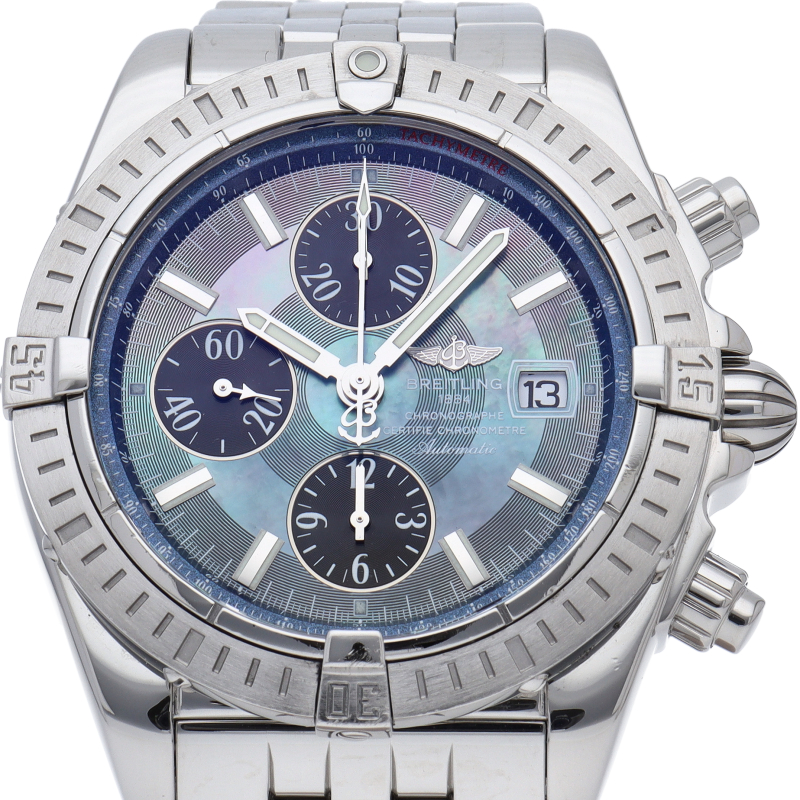 ブライトリングの生産終了となった人気モデル。存在感のあるビッグケースにデイト表示・逆回転防止ベゼルを備えたデザイン性と実用性の兼ね備えた1本。A13356/A156BMPPA