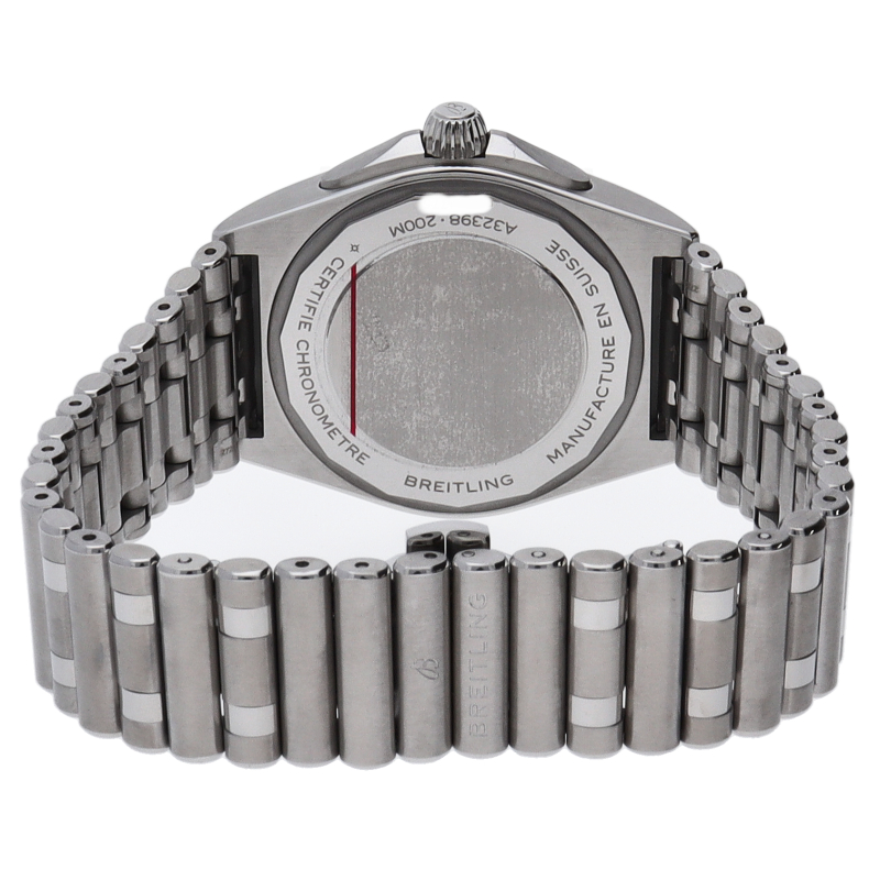 ブライトリングのフラグシップモデルとして高い人気を誇る「クロノマット」コレクション。独特なルーローブレスレットが際立ちます。ムーブメントには「Cal.ブライトリング32」を搭載。GMT機能を搭載しており、24時間スケールによりセカンドタイムゾーンを追跡、昼夜を一目で把握することができます。A32398/A32398101B1A1。