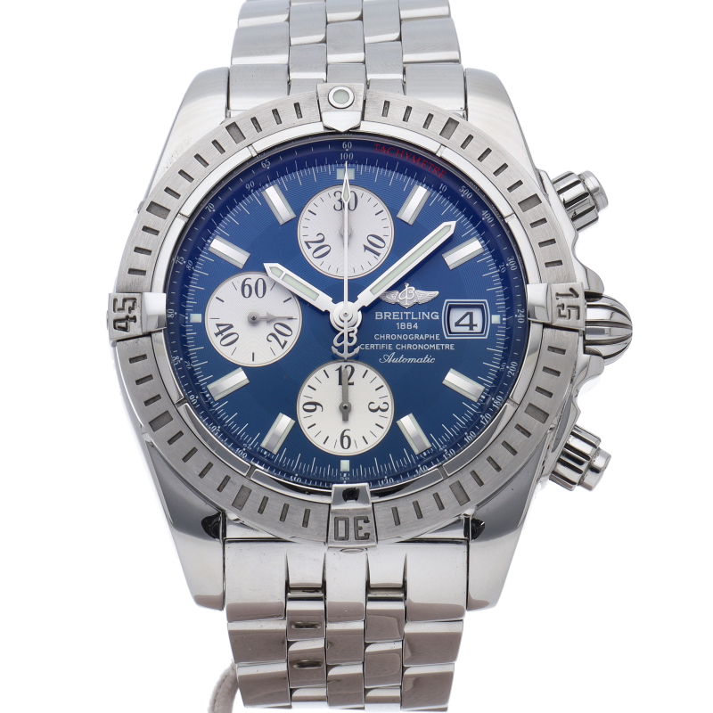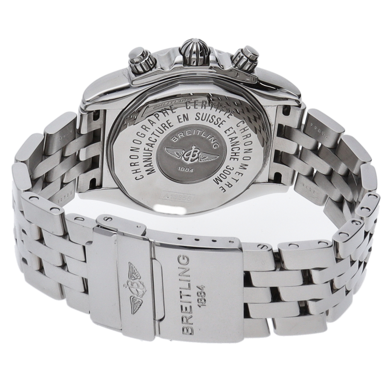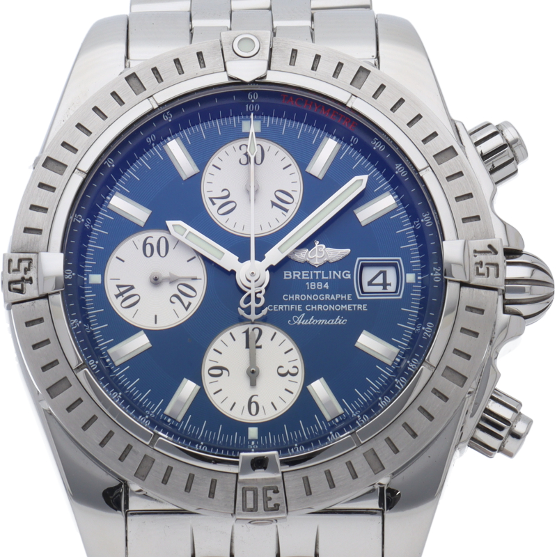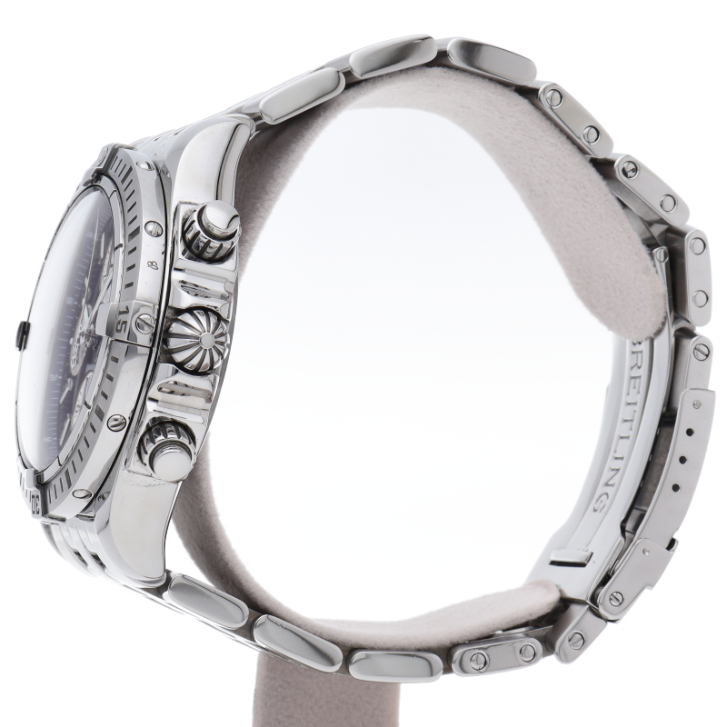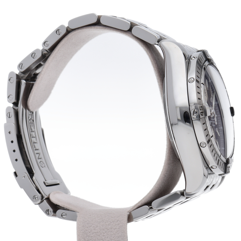 ブライトリングの生産終了となった人気モデル。存在感のあるビッグケースにデイト表示・逆回転防止ベゼルを備えたデザイン性と実用性の兼ね備えた1本。A13356/A156C45PA。
