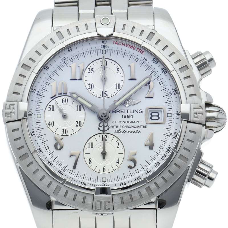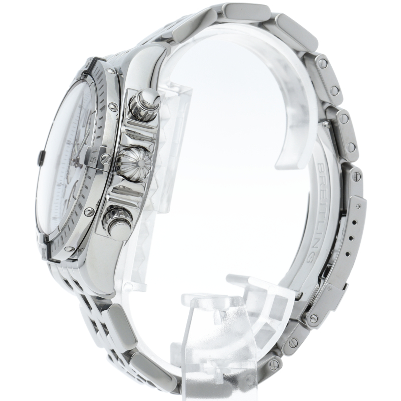 ブライトリングの生産終了となった人気モデル。存在感のあるビッグケースにデイト表示・逆回転防止ベゼルを備えたデザイン性と実用性の兼ね備えた1本。A13356/A156A73PA