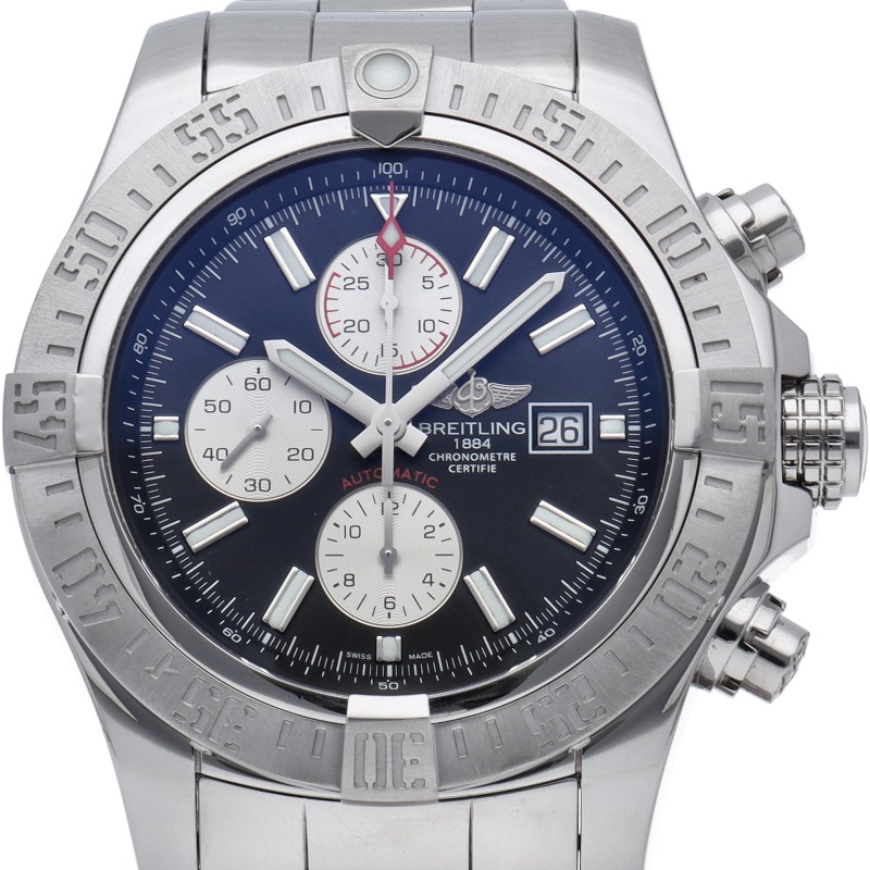 ケース径48mmの大型ダイバークロノグラフ「スーパーアベンジャーII」。過酷な使用環境を想定し、極厚のサファイヤクリスタルガラスや、プロテクタに保護されたねじ込みロック式リューズなどを採用しています。A13371/A13371111B1A1。