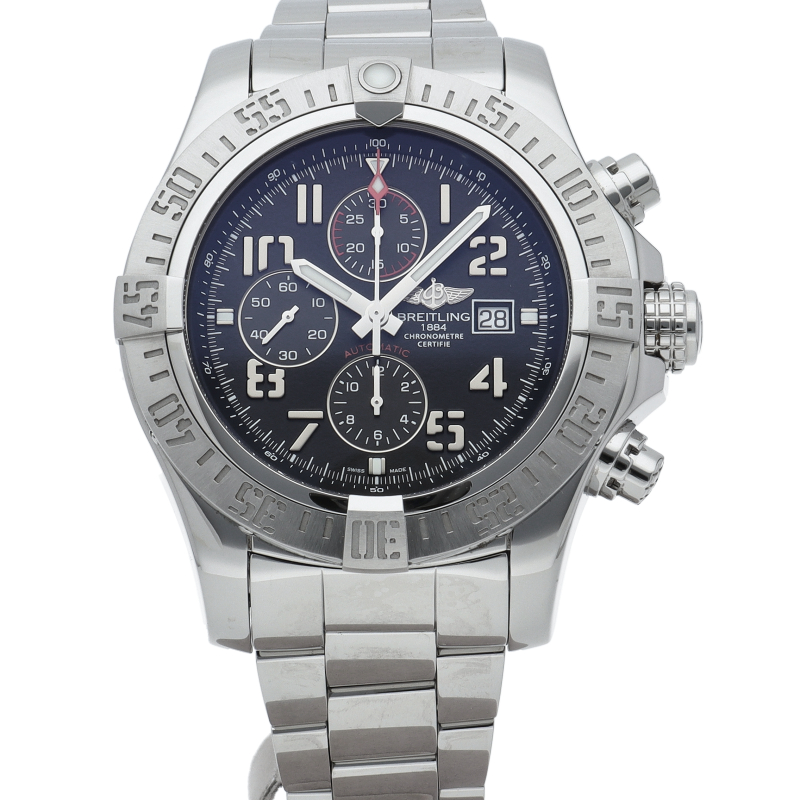 ケース径48mmの大型ダイバークロノグラフ「スーパーアベンジャーII」。過酷な使用環境を想定し、極厚のサファイヤクリスタルガラスや、プロテクタに保護されたねじ込みロック式リューズなどを採用しています。A13371/A1337111/BC28。