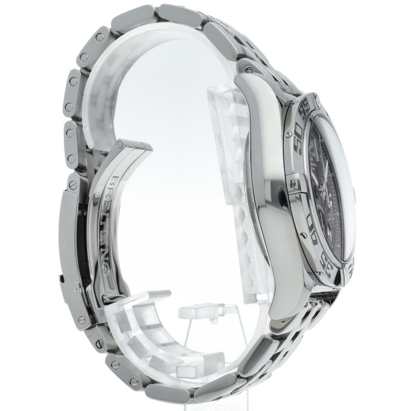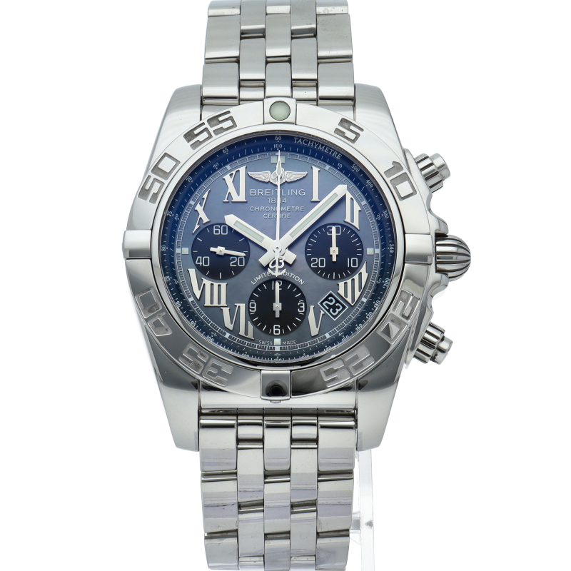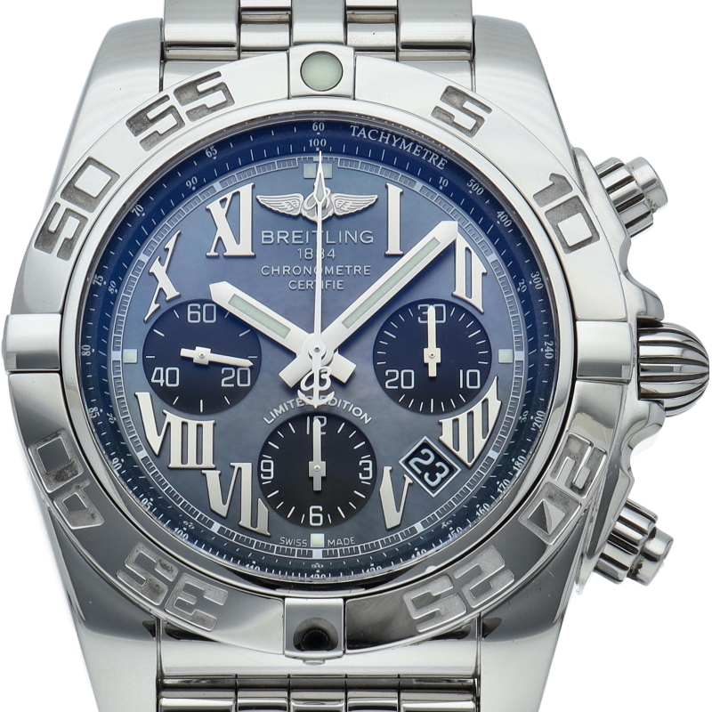 ブライトリング初の自社開発ムーブメント“キャリバーB01”を搭載した「クロノマット44」。70時間のパワーリザーブや24時間いつでも調整可能なデイト機能、1/4秒まで計測可能なクロノグラフなど同社のクロノグラフへの情熱が込められています。日本500本限定の希少モデル。AB0111/AB01111A/BG64。