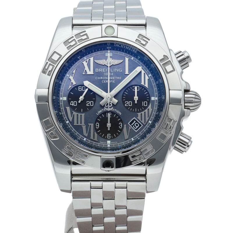 ブライトリング初の自社開発ムーブメント“キャリバーB01”を搭載した「クロノマット44」。70時間のパワーリザーブや24時間いつでも調整可能なデイト機能、1/4秒まで計測可能なクロノグラフなど同社のクロノグラフへの情熱が込められています。日本500本限定の希少モデル。AB0111/AB01111A/BG64。