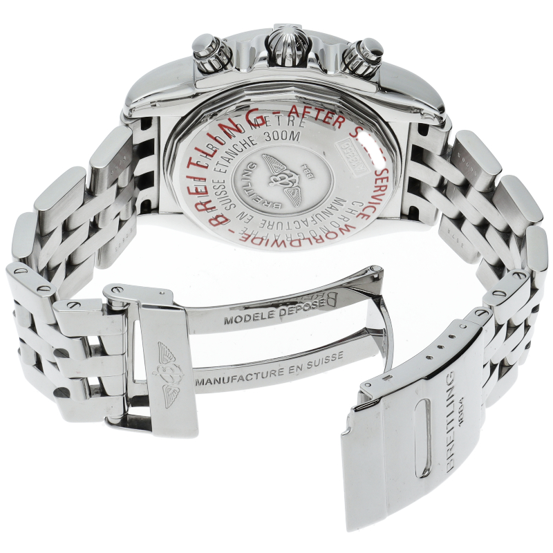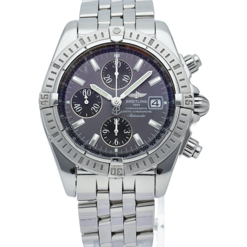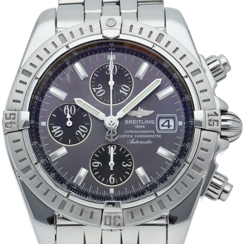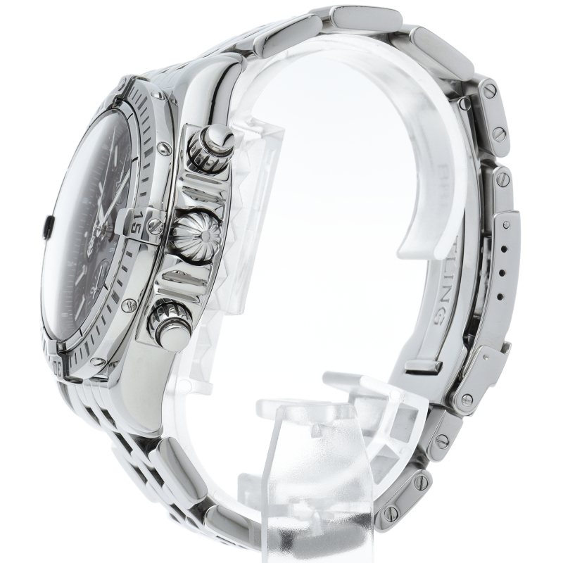 ブライトリングの生産終了となった人気モデル。存在感のあるビッグケースにデイト表示・逆回転防止ベゼルを備えたデザイン性と実用性の兼ね備えた1本。A13356/A156F17PA。