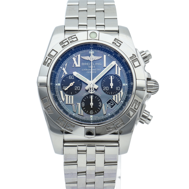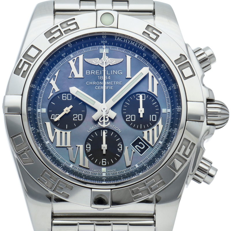 ブライトリング初の自社開発ムーブメント“キャリバーB01”を搭載した「クロノマット44」。70時間のパワーリザーブや24時間いつでも調整可能なデイト機能、1/4秒まで計測可能なクロノグラフなど同社のクロノグラフへの情熱が込められています。日本500本限定の希少モデル。AB0111/AB01111A/BG64。