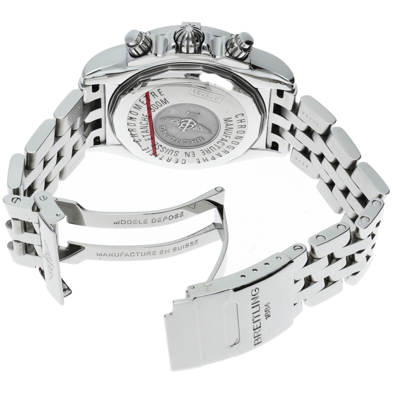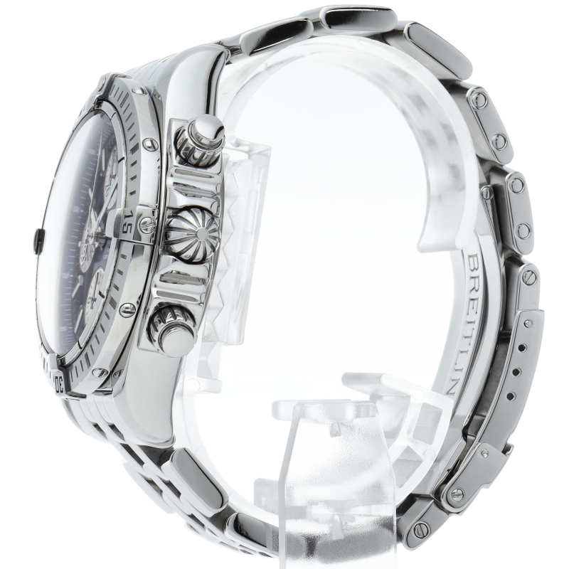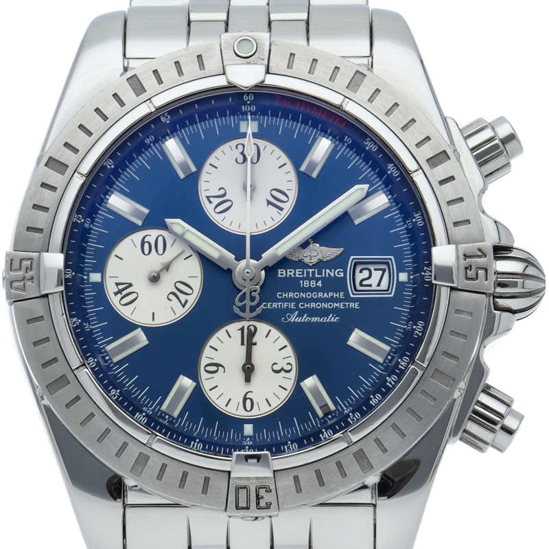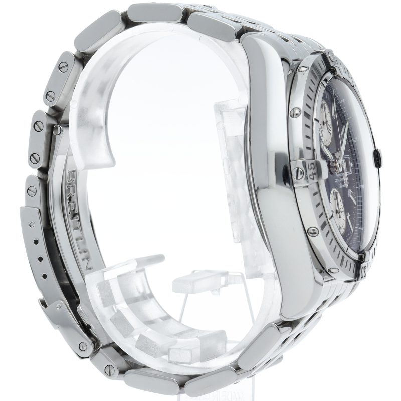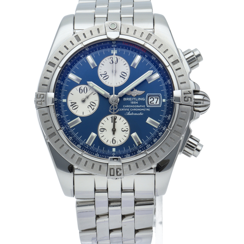 ブライトリングの生産終了となった人気モデル。存在感のあるビッグケースにデイト表示・逆回転防止ベゼルを備えたデザイン性と実用性の兼ね備えた1本。A13356/A156C45PA。