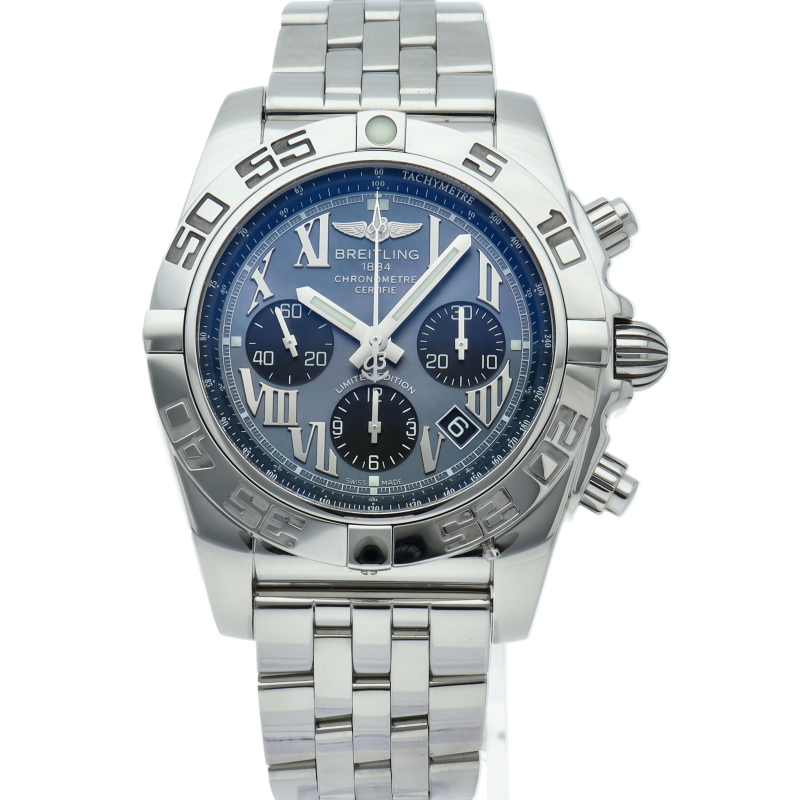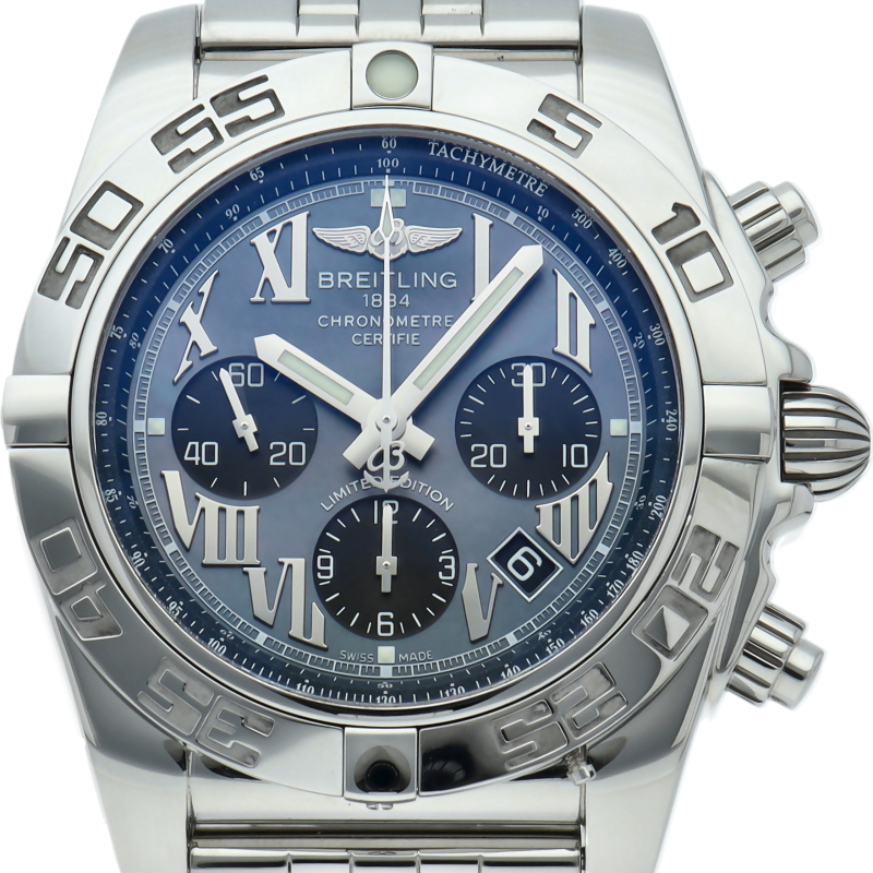 ブライトリング初の自社開発ムーブメント“キャリバーB01”を搭載した「クロノマット44」。70時間のパワーリザーブや24時間いつでも調整可能なデイト機能、1/4秒まで計測可能なクロノグラフなど同社のクロノグラフへの情熱が込められています。日本500本限定の希少モデル。AB0111/AB01111A/BG64。
