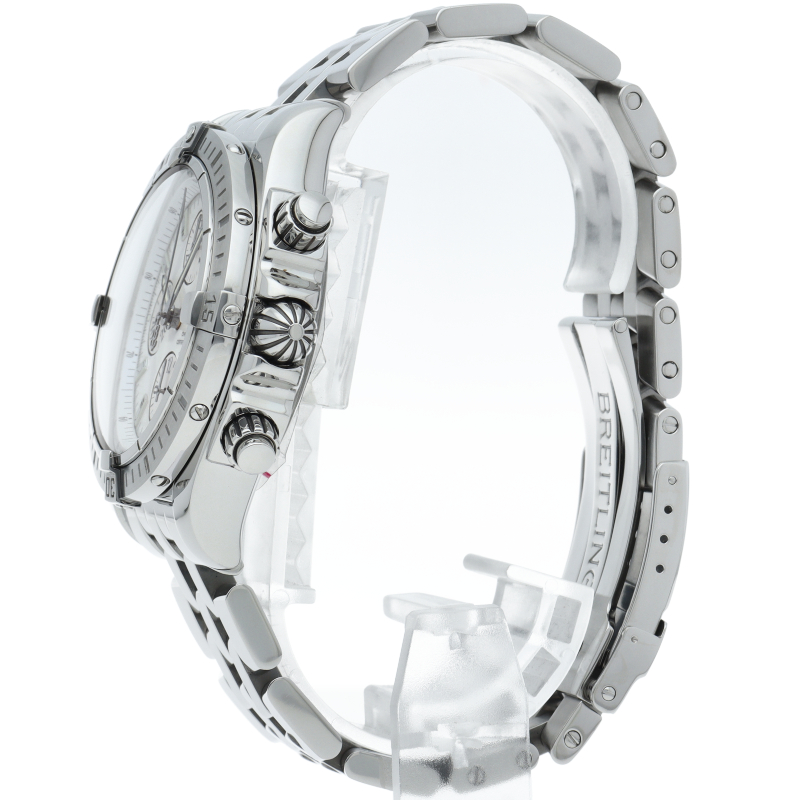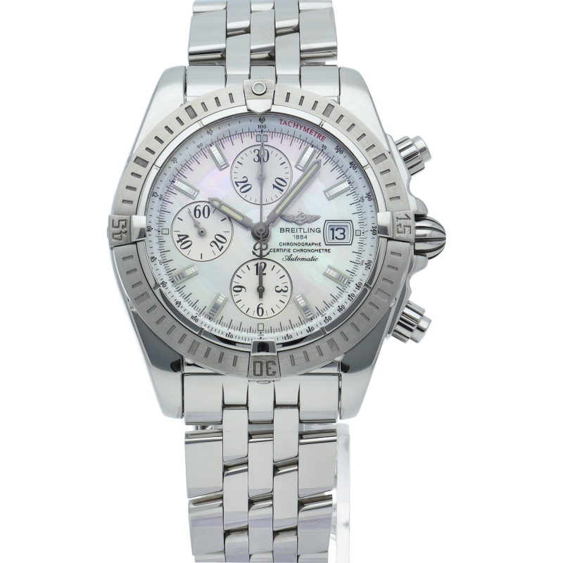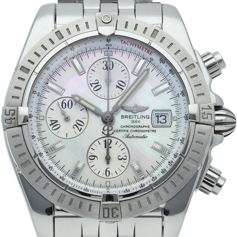 ブライトリングの生産終了となった人気モデル。存在感のあるビッグケースにデイト表示・逆回転防止ベゼルを備えたデザイン性と実用性の兼ね備えた1本。ホワイトシェルの文字盤が清涼感を漂わせます。A13356/A156A69PA。