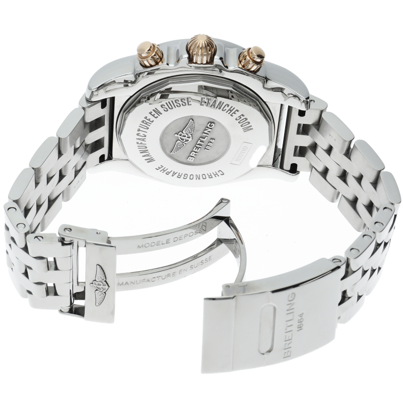 ブライトリングが完成させた、もっとも優れたメカニカル・クロノグラフ。完全自社開発・製造ムーブメントを初めて搭載したモデルであり、70時間パワーリザーブ、24時間早送りを可能にしたカレンダー機構などさらなる進化を達成。IB0110/B011B57PAC。