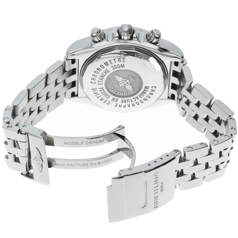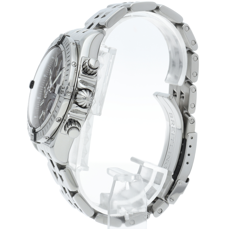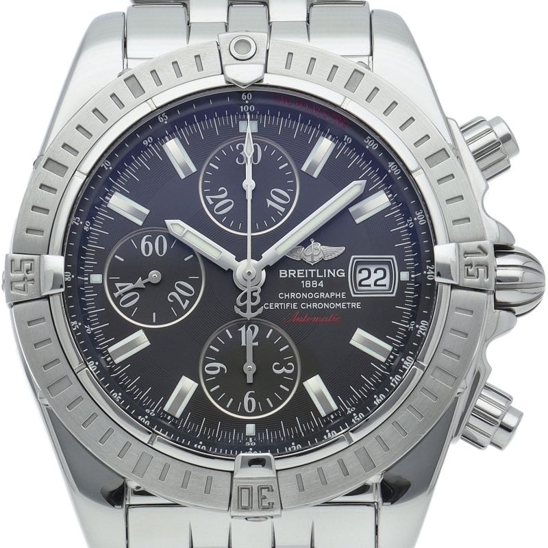 ブライトリングの生産終了となった人気モデル。存在感のあるビッグケースにデイト表示・逆回転防止ベゼルを備えたデザイン性と実用性の兼ね備えた1本。A13356/A156M12PA。