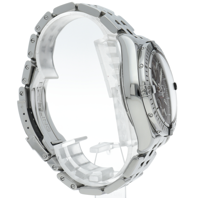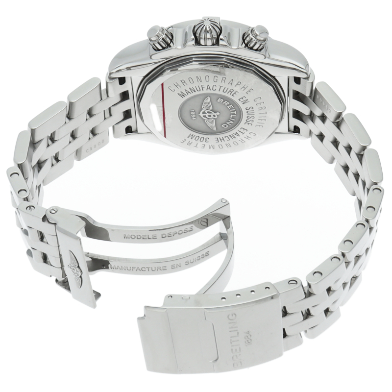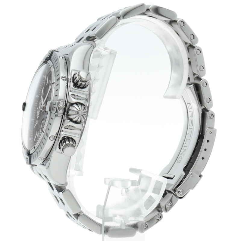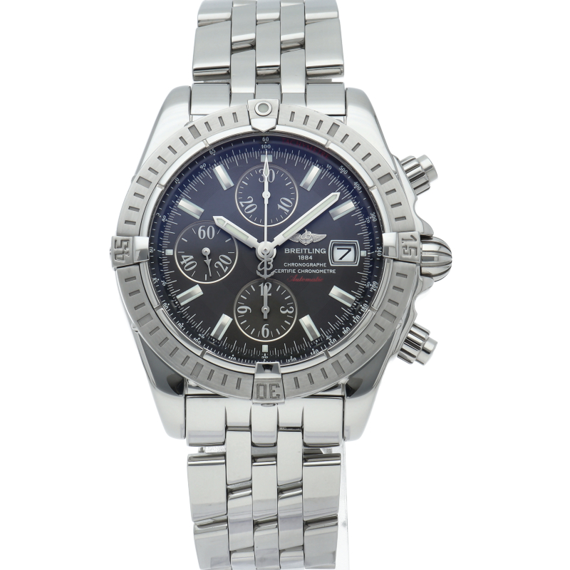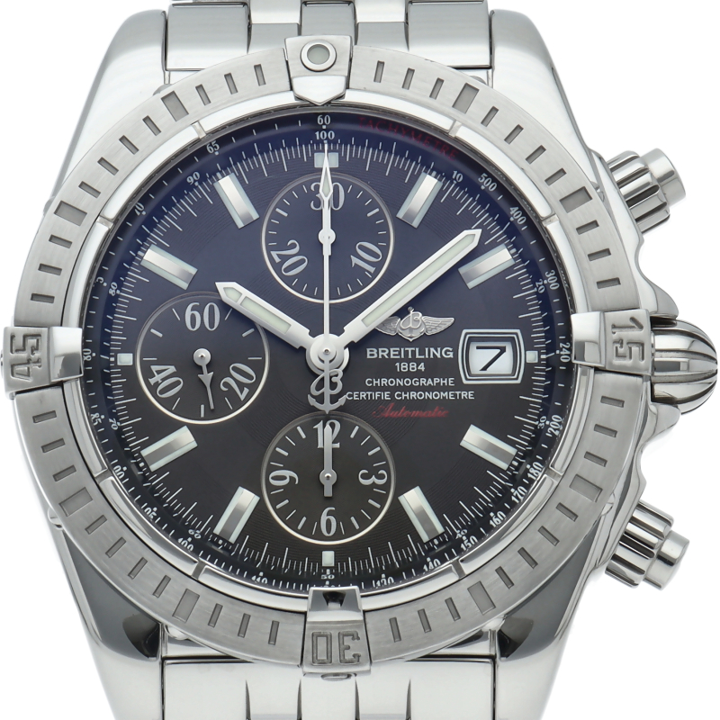ブライトリングの生産終了となった人気モデル。存在感のあるビッグケースにデイト表示・逆回転防止ベゼルを備えたデザイン性と実用性の兼ね備えた1本。