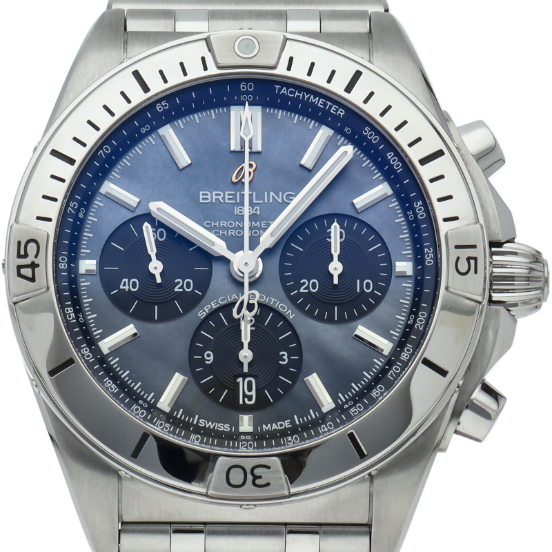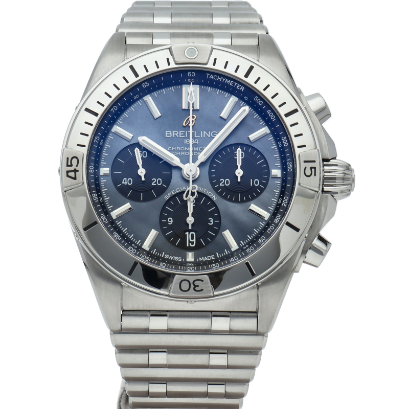 湾曲しないラグを備えた42mmのケースに、4カ所にライダータブを配したアイコニックなベゼルを装備。独特なルーローブレスレットが際立ちます。ブラック マザーオブパール文字盤に金色のBロゴが映えるこの日本限定モデルは、機能性を維持しながら真珠母貝による唯一無二の美しさまで兼ね備えたタイムピースです。AB0134/AB0134101B3A1