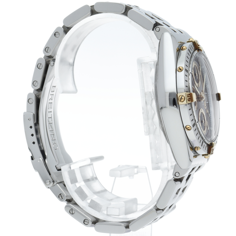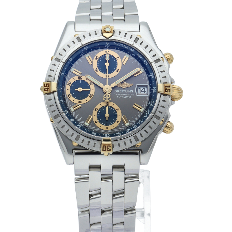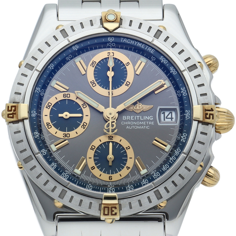 クロノマットのエボリューションの前のモデルの最終型となる「クロノマット2000」。リューズやベゼルビスに18金を使用した「ビコロ」です。現行モデルに比べ小ぶりなケースが逆に新鮮です。B13352。