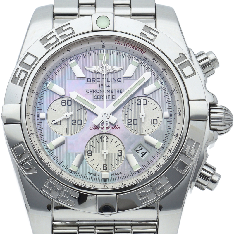 ブライトリング初の自社開発ムーブメント「B01」を搭載した「クロノマット44」。近年のブライトリングの新作中、最も注目度の高いモデル。自社開発の「キャリバーB01」を搭載した記念すべきモデルです。70時間のパワーリザーブや、常時調整可能なデイト機能など、同社のクロノグラフへの情熱が込められています。珍しいシェル文字盤。AB0110/A011G85PA
