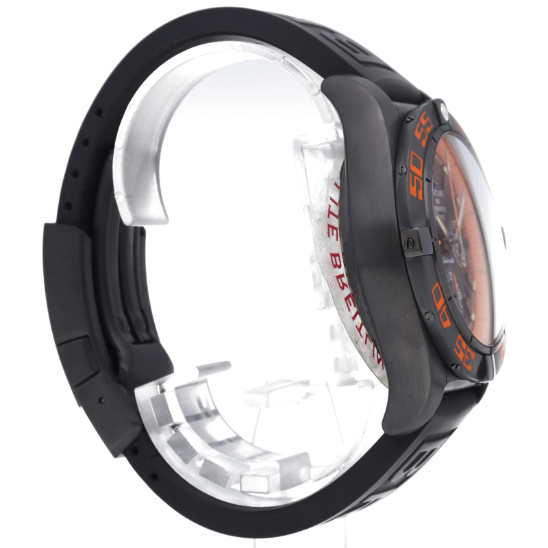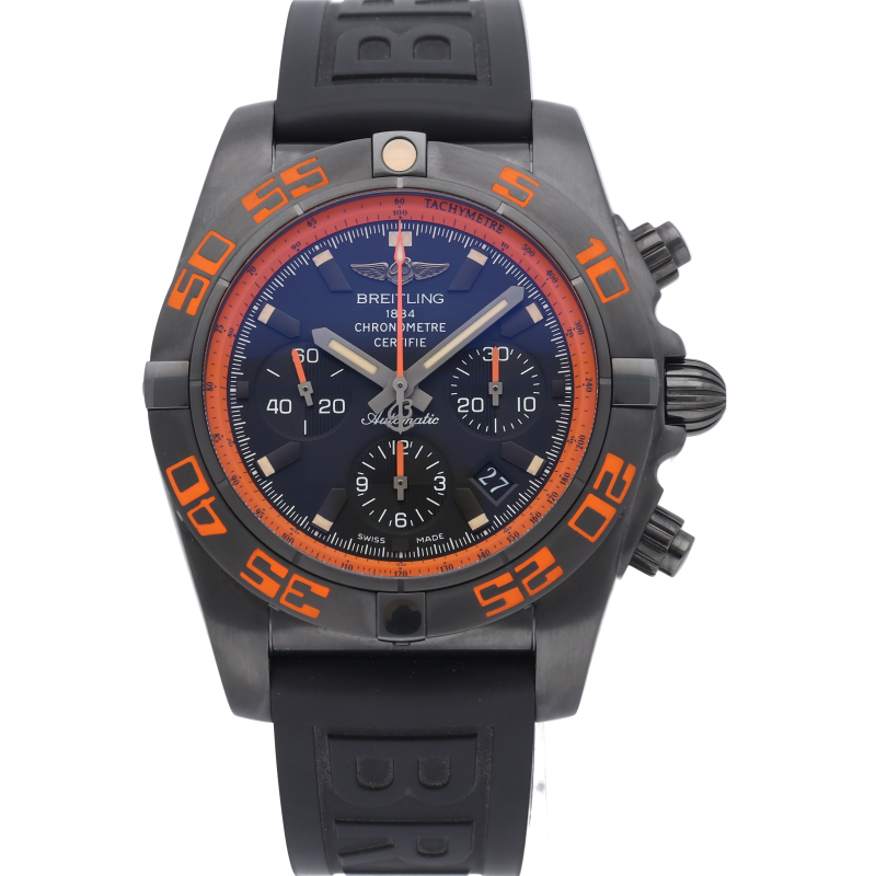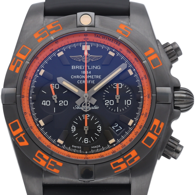 1983年にイタリア空軍「フレッチェトリコローリ」との共同開発されたモデルをベースに、翌1984年に誕生した「クロノマット」コレクション。こちらは2014年に登場したリファレンスで、DLC加工が施された44mm径のブラックスチール製ケースに差し色のオレンジが映えるタイムピースです。。MB0111/MB0111C2/BD07