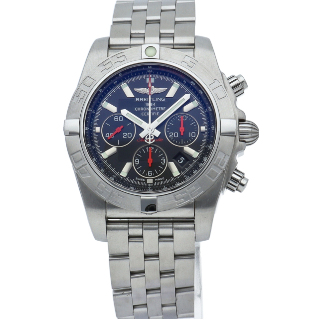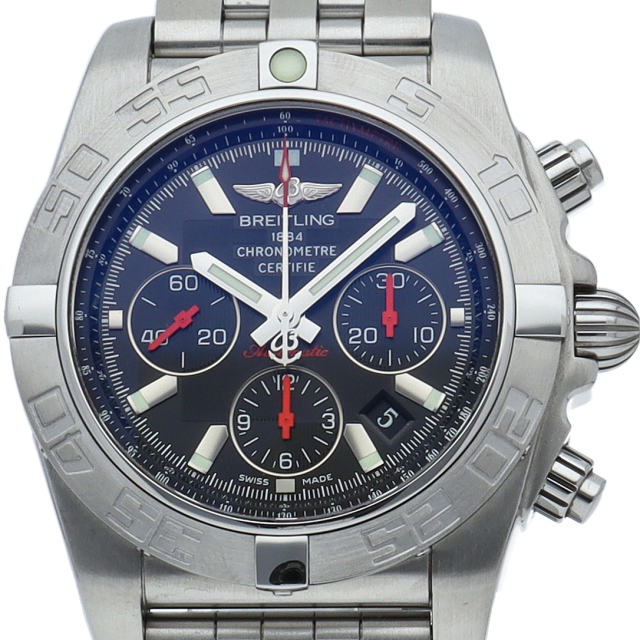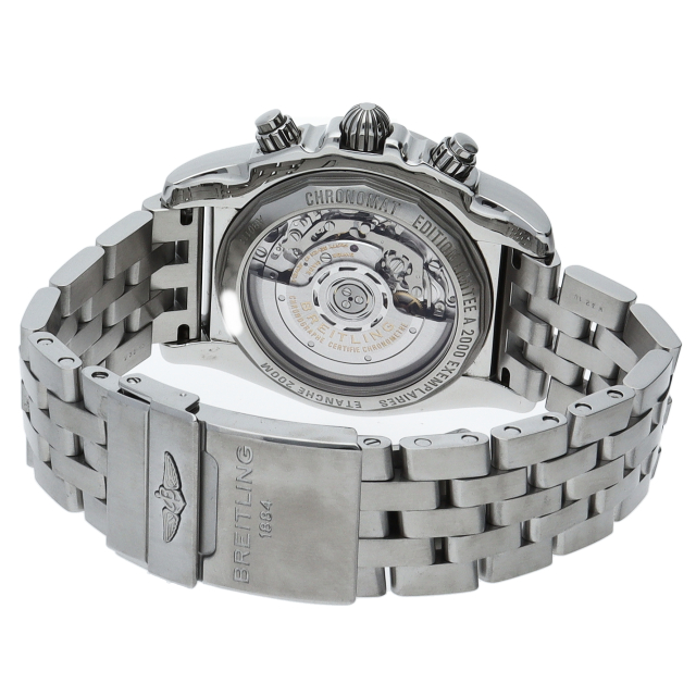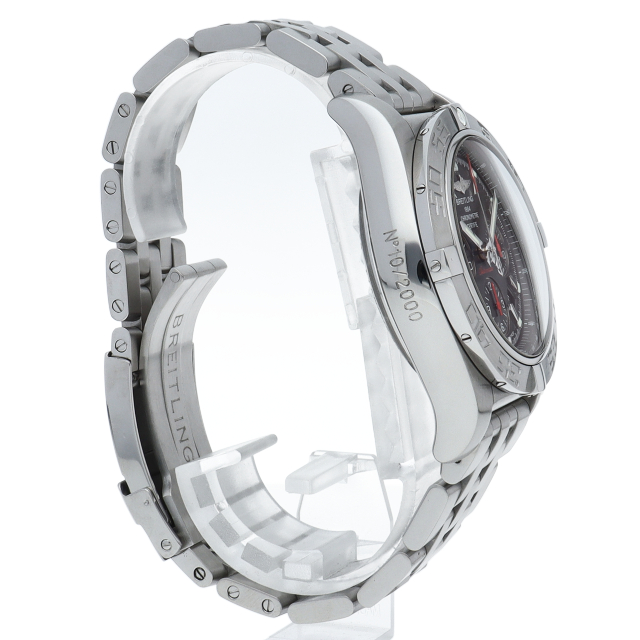 ブライトリングの完全自社開発・自社製造クロノグラフ「キャリバー01」搭載。レギュラーラインは500m防水ですが、こちらの限定モデルはシースルーバックのため200mと控えめな防水仕様となります。AB0111(AB011110/BA50)