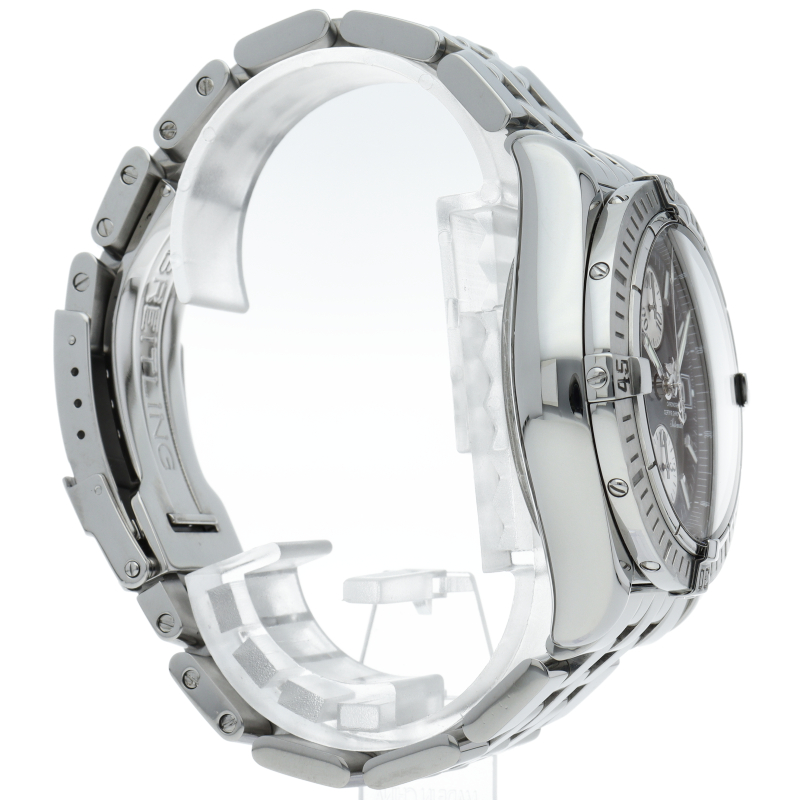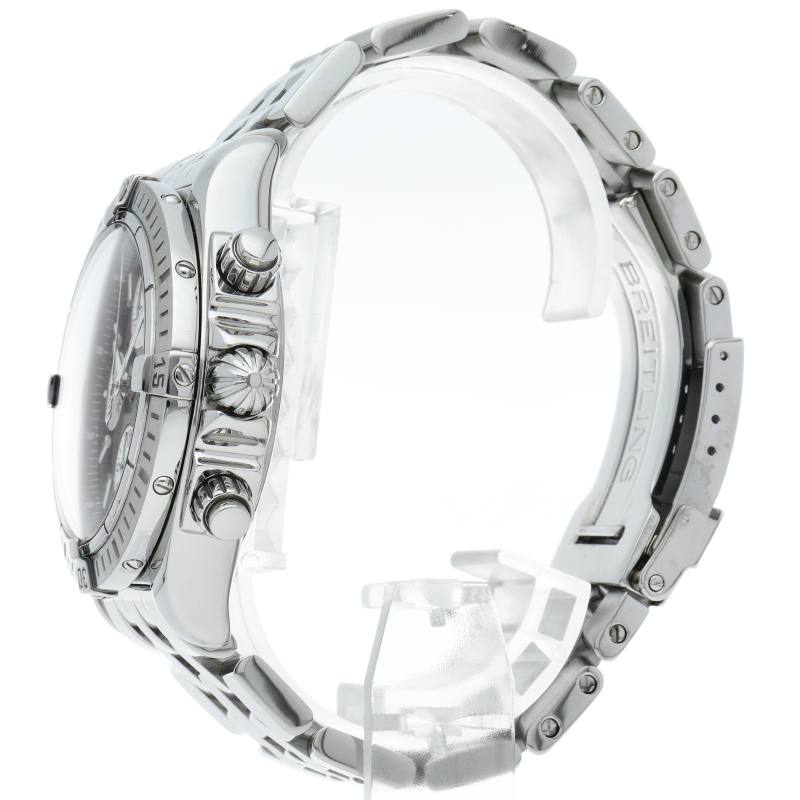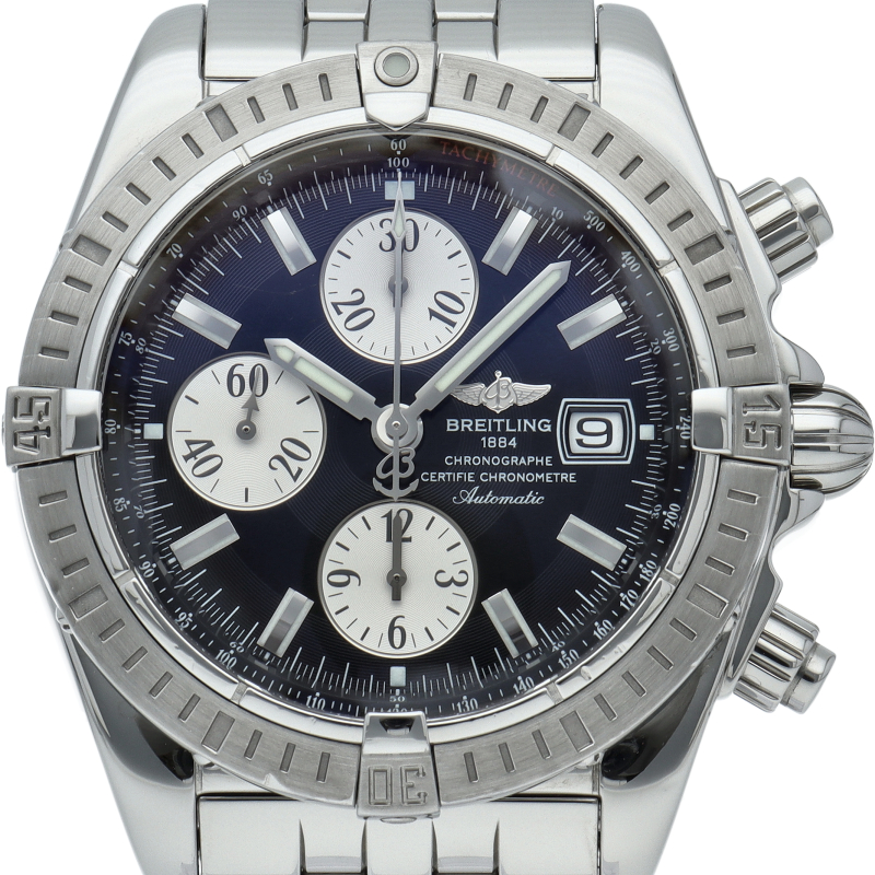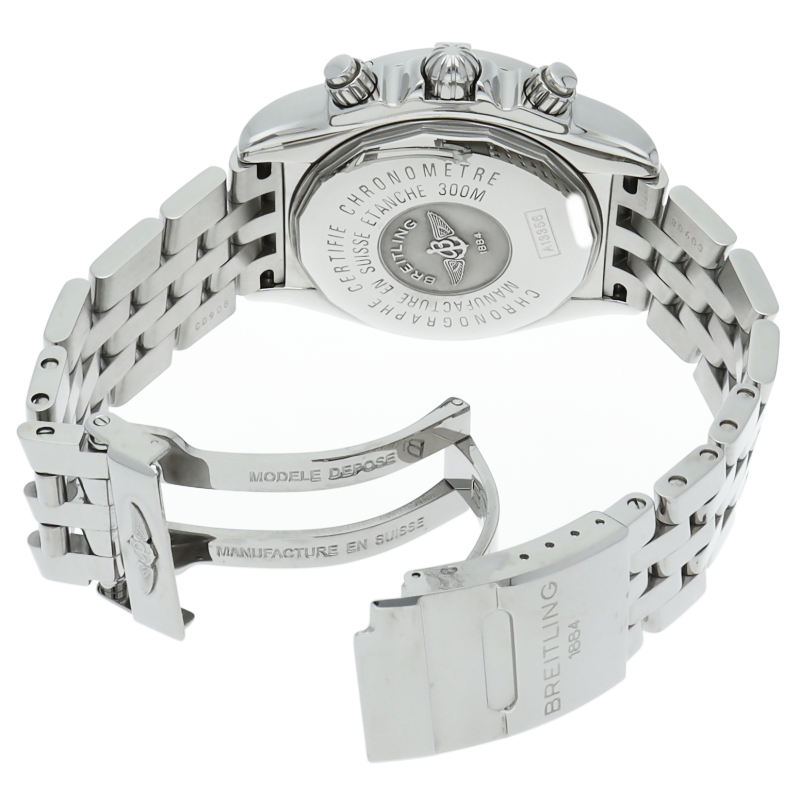 ブライトリングの生産終了となった人気モデル。存在感のあるビッグケースにデイト表示・逆回転防止ベゼルを備えたデザイン性と実用性の兼ね備えた1本。A13356/A156C45PA。