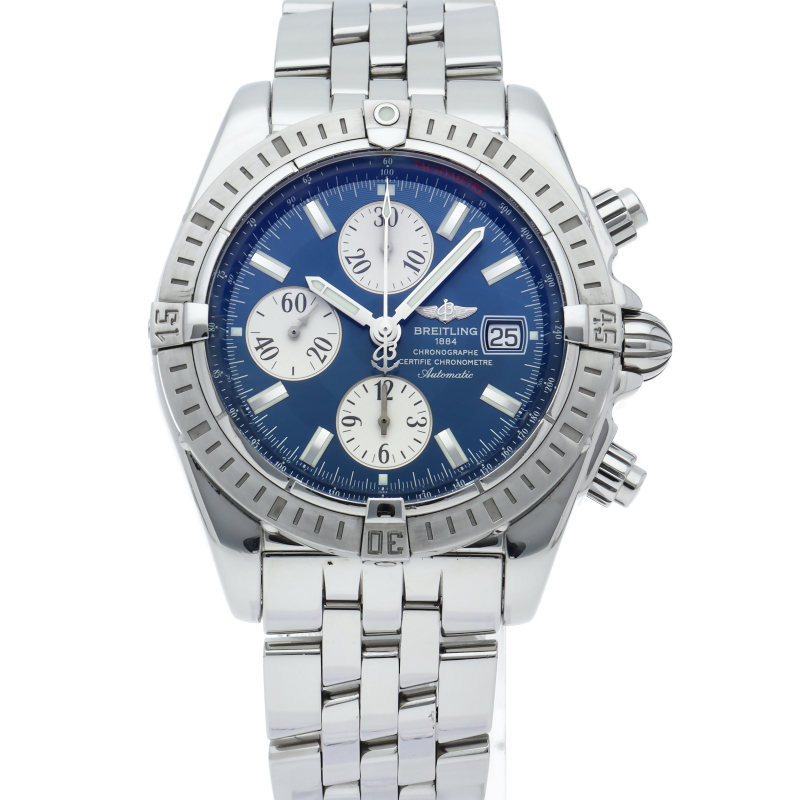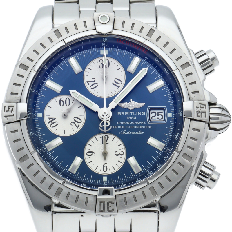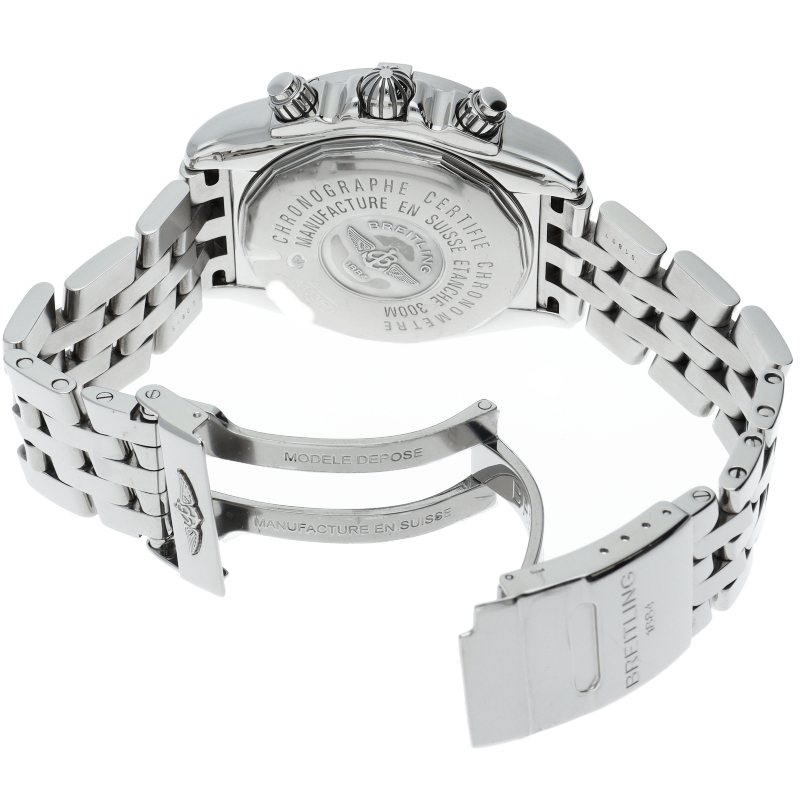 ブライトリングの生産終了となった人気モデル。存在感のあるビッグケースにデイト表示・逆回転防止ベゼルを備えたデザイン性と実用性の兼ね備えた1本。A13356/A156C45PA。